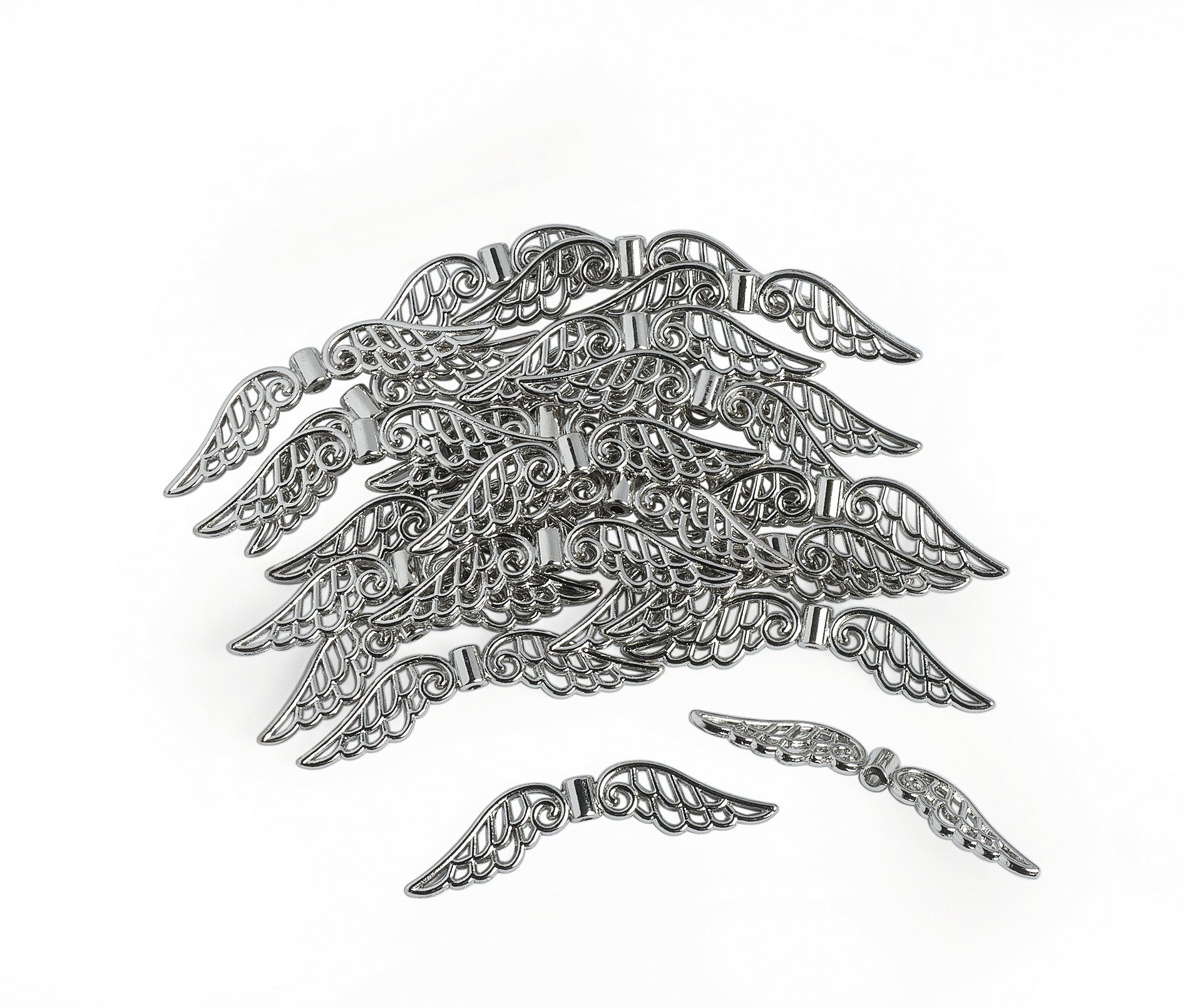 25 Flügelperlen aus Metall für kreative Schmuckideen. Die silberfarbenen Perlen in Flügel Form haben eine Lochgröße von ca. 2 mm und eignen sich besonders schön in Kombination mit anderen Perlen an Ketten und Armbändern. Die Perlen sind ca. 5,2 cm breit und haben eine Höhe von ca. 1,3 cm.