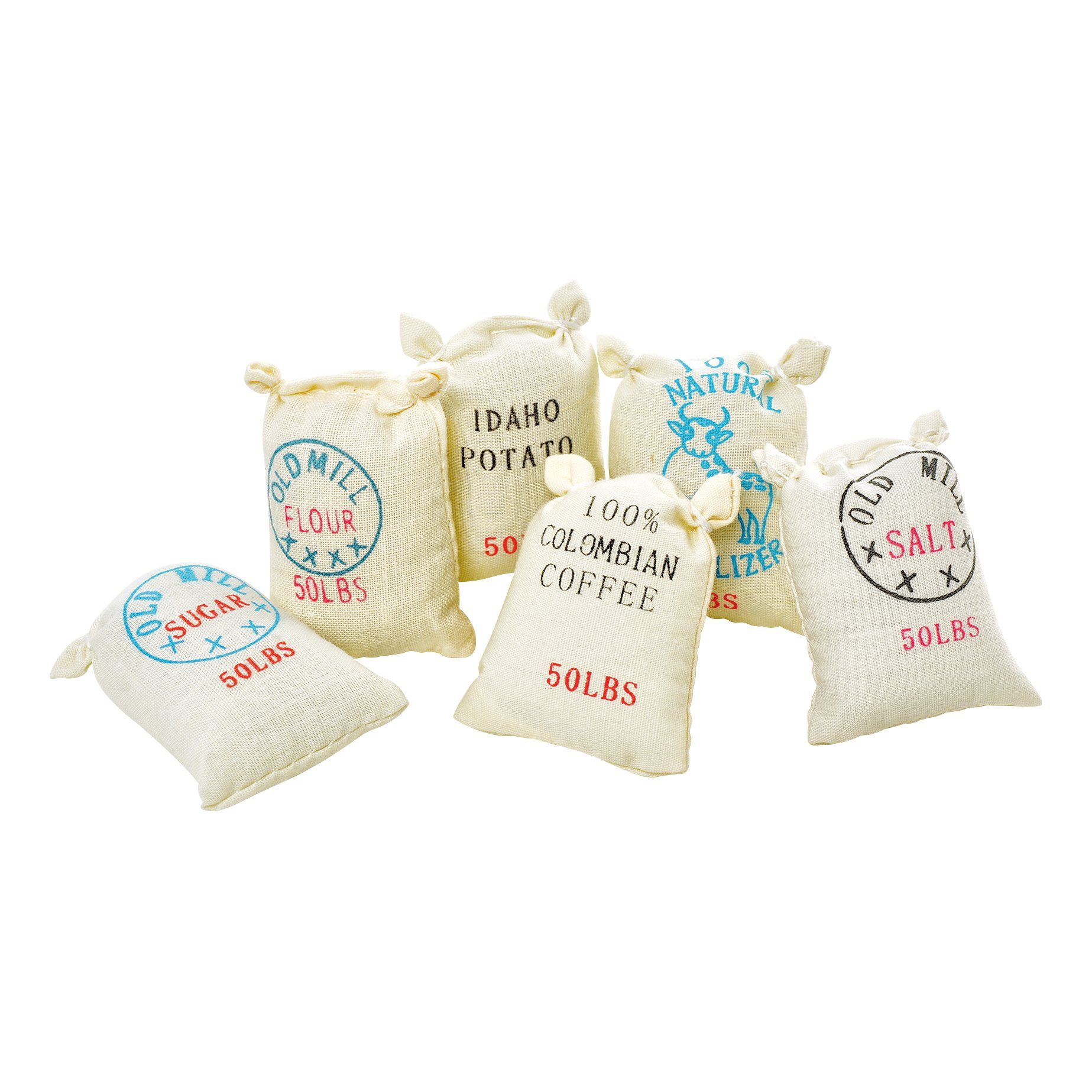 6 kleine und naturgetreue Jutesäcke, mit denen Sie bei Ihrem Miniaturen basteln sogar Hafenwelten darstellen können. 50 Lbs. Säcke kommen mit verschiedenen Lebensmitteln-Aufdrucken frisch aus Übersee. Die Säcke eignen sich aber auch hervorragend zum Basteln und Dekorieren für den Kaufmannsladen, ein Weihnachtsdorf oder eine Puppenstube.