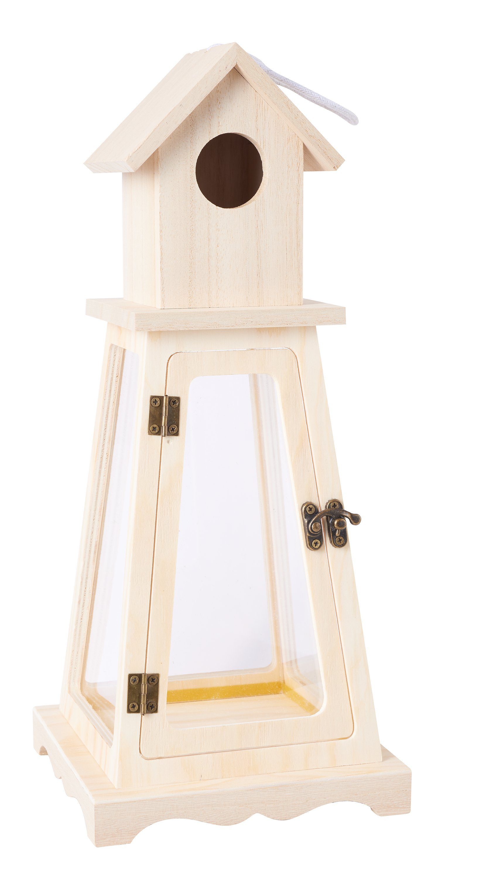 Der Leuchtturm ist aus unbehandeltem Holz und die Scheiben aus Kunststoff. Das Holz kann nach Belieben bemalt oder beklebt werden.