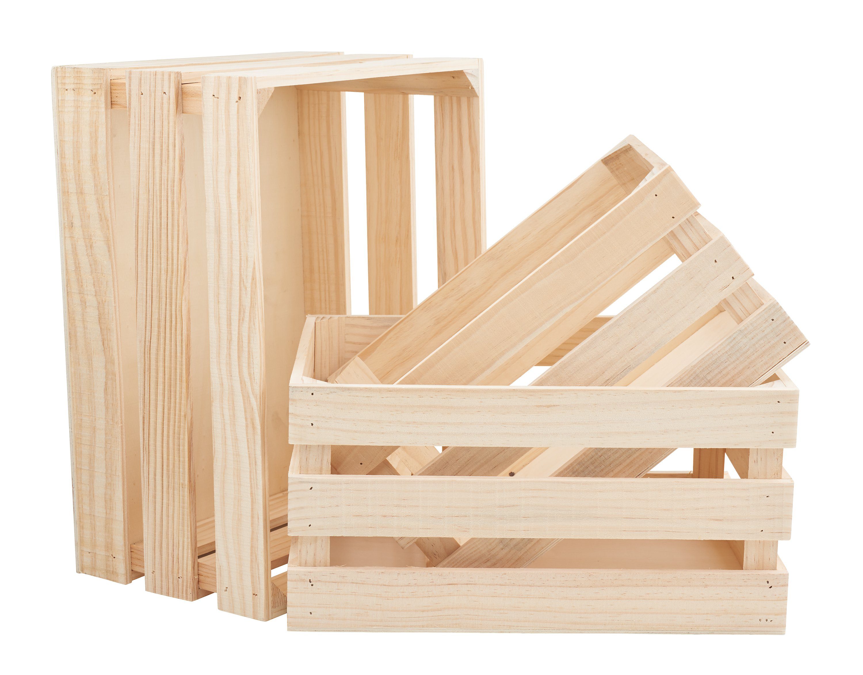 Dieses 3er-Set VBS Holzkisten/Obstkisten hat eine Размер von ca. L 40 x B 30 x H 19,5 cm, L 36 x B 26 x H 18 cm und L 32 x B 22 x 16,5 cm. Die wunderbaren Obstkisten haben jeweils an den Seiten kleine Griffmulden. Das Material ist Kiefernholz mit einem Boden aus Sperrholz. Eine dekorative Aufbewahrung die individuell mit Bastelfarben, Lasur oder Tafelfarbe gestaltet werden kann.