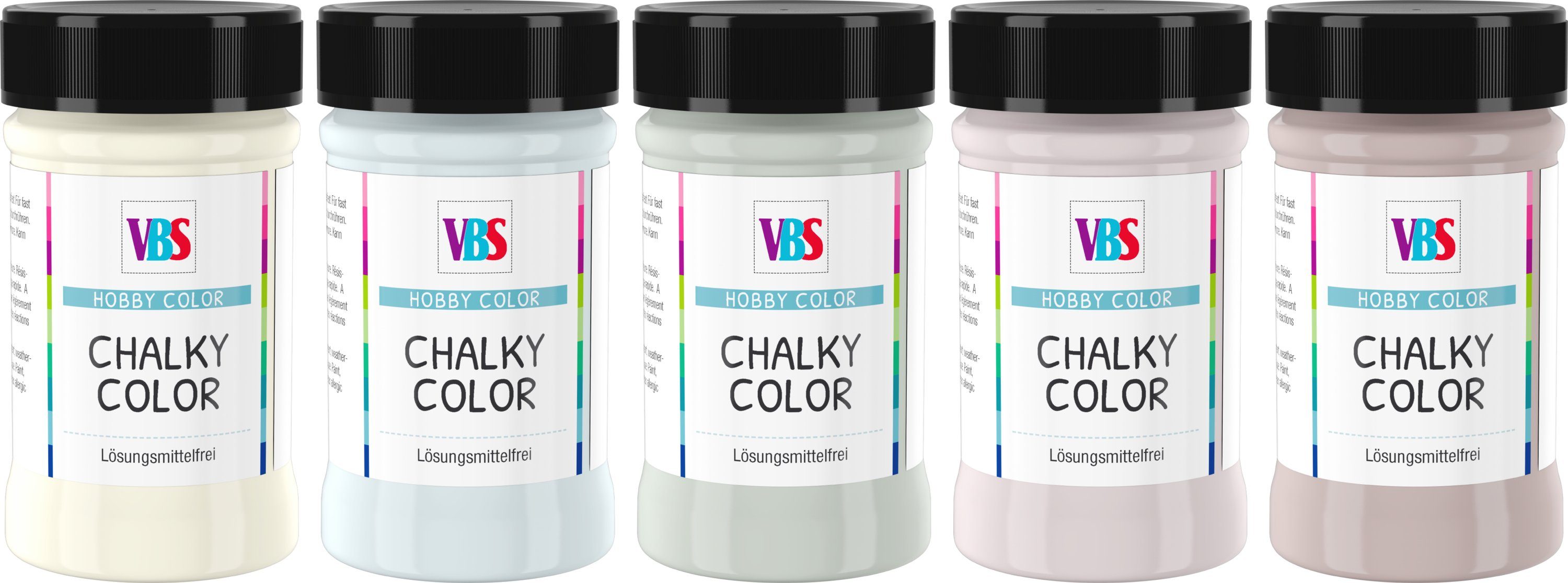 In diesem Set sind 5 schöne Farbtöne der VBS Chalky Color. Inhalt je 100 ml in den Farben Vanille, Himmelblau, Staubiges Grün, Staubiges Rose, Nugatbraun. Hochwertige Farbe im Shabby-Look!