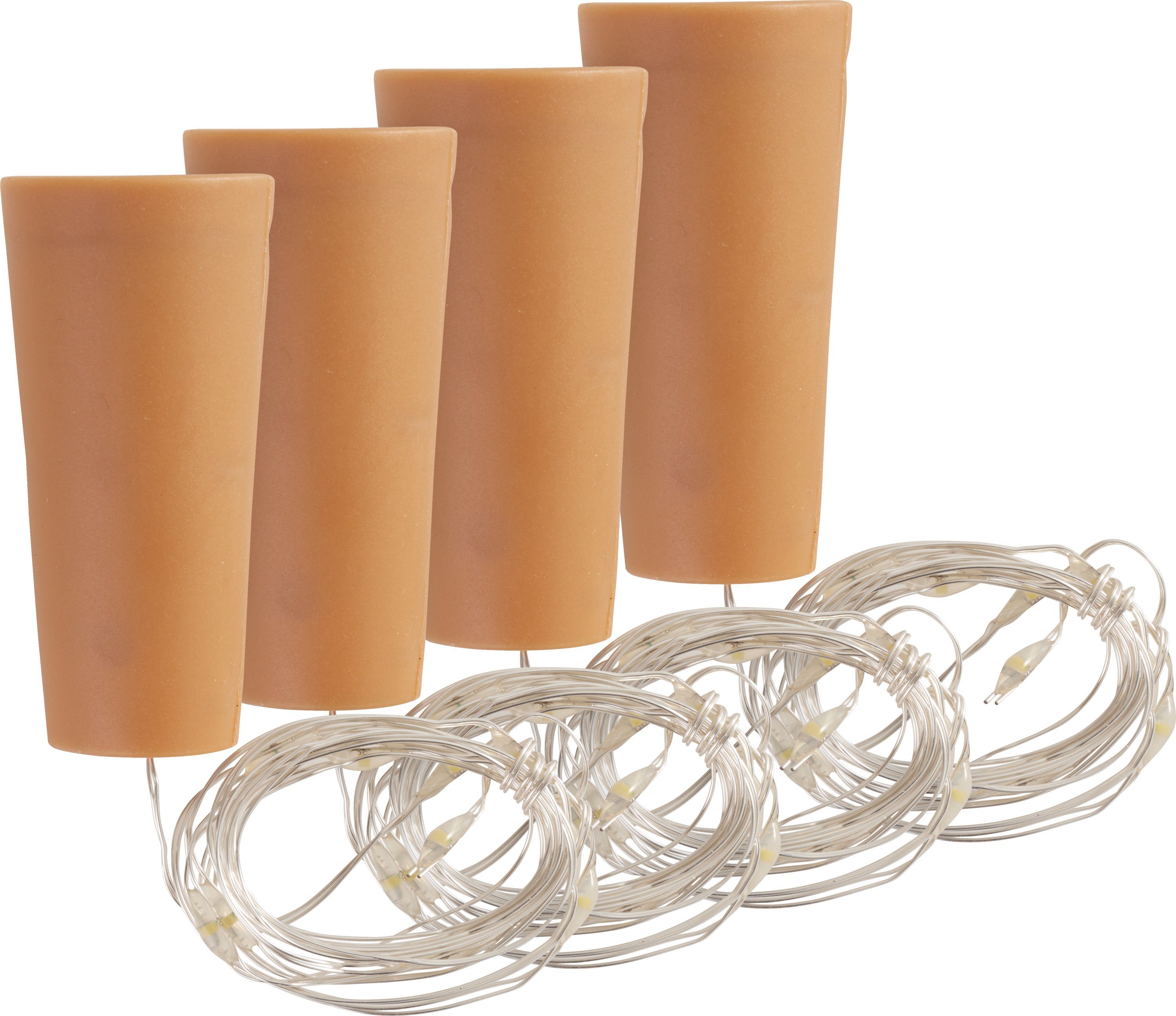 VBS Micro LED Lichterkette Flaschenkorken, 4 Stück mit jeweils 10 warmweißen Lämpchen. Der Korken mit Ein- und Ausschalter hat eine Размер von ca. 4,8 cm mit einem Ø oben von ca. 2,3 cm und Ø unten ca. 1,1 cm. Die batteriebetriebenen Lichterketten mit biegsamem Draht sind insgesamt ca. 95 cm lang. Im Korken befindet sich das Batteriefach, sodass sich keine Gedanken um dessen Verstecken gemacht werden müssen. Eine schlichte Flasche lässt sich mit Serviettentechnik, Glasmalfarbe, Handlettering, Washi Tape oder auch Folie individuell gestalten und mit der Lichterkette stimmungsvoll zum Leuchten bringen. Eine super Dekoration in der Winter- und Weihnachtszeit. Achtung: Nicht in gefüllten Flaschen betreiben. Die Lichterketten werden mit je 1 x LR44 Batterien betrieben.