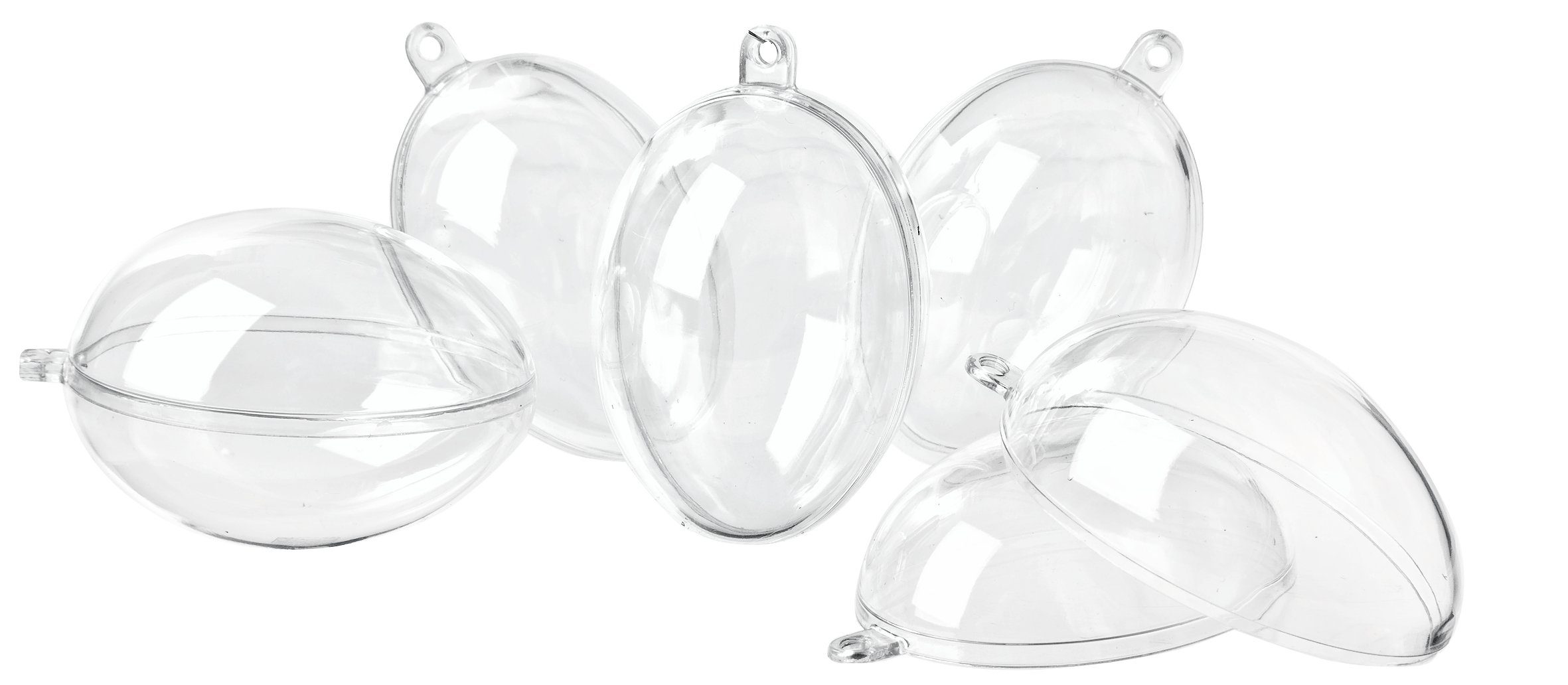 6er-Pack Acryleier aus Kunststoff mit einer Длина von ca. 6 cm inkl. Aufhängeöse.Die Kunststoffeier sind transparent, teilbar und wieder verschließbar.