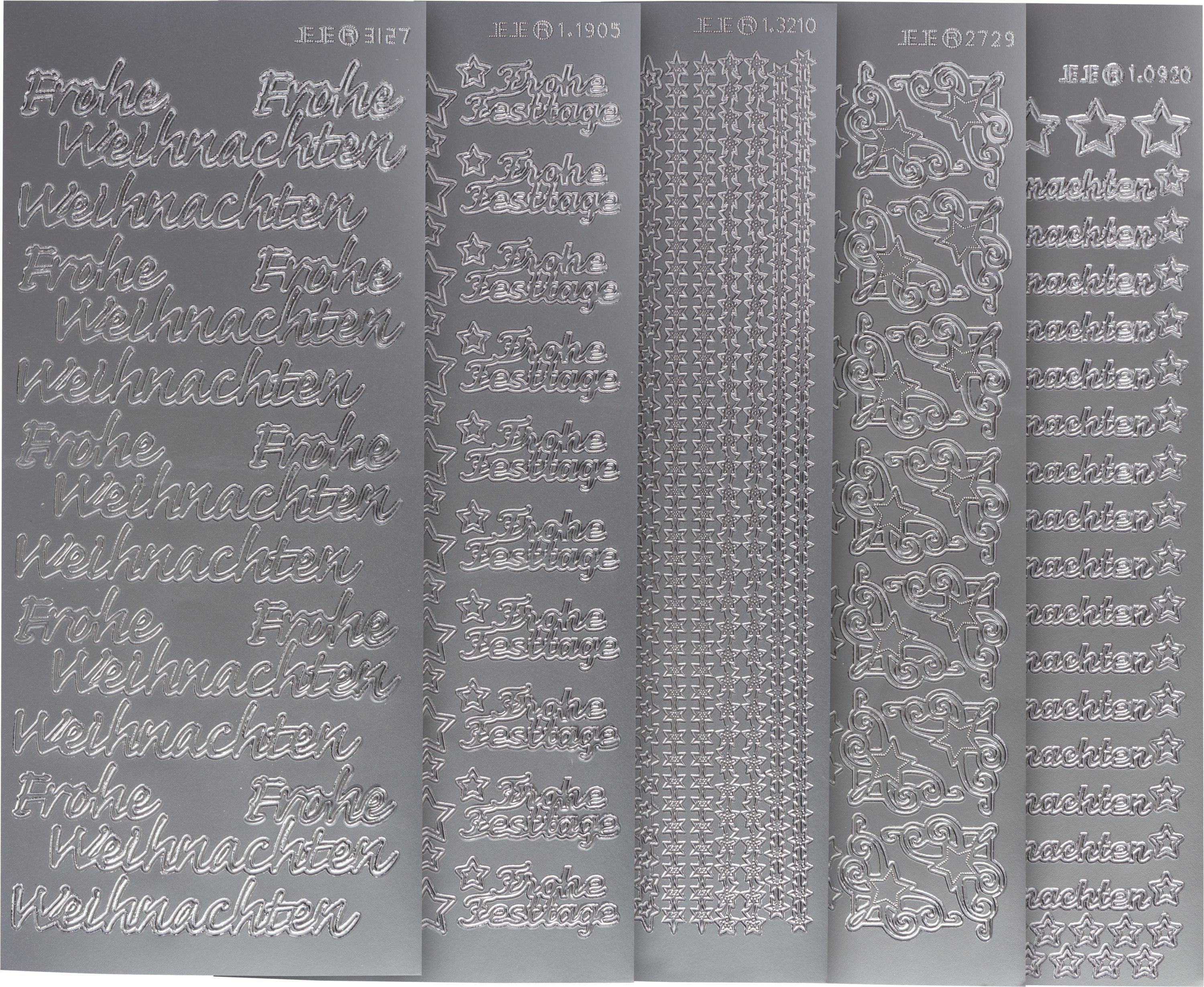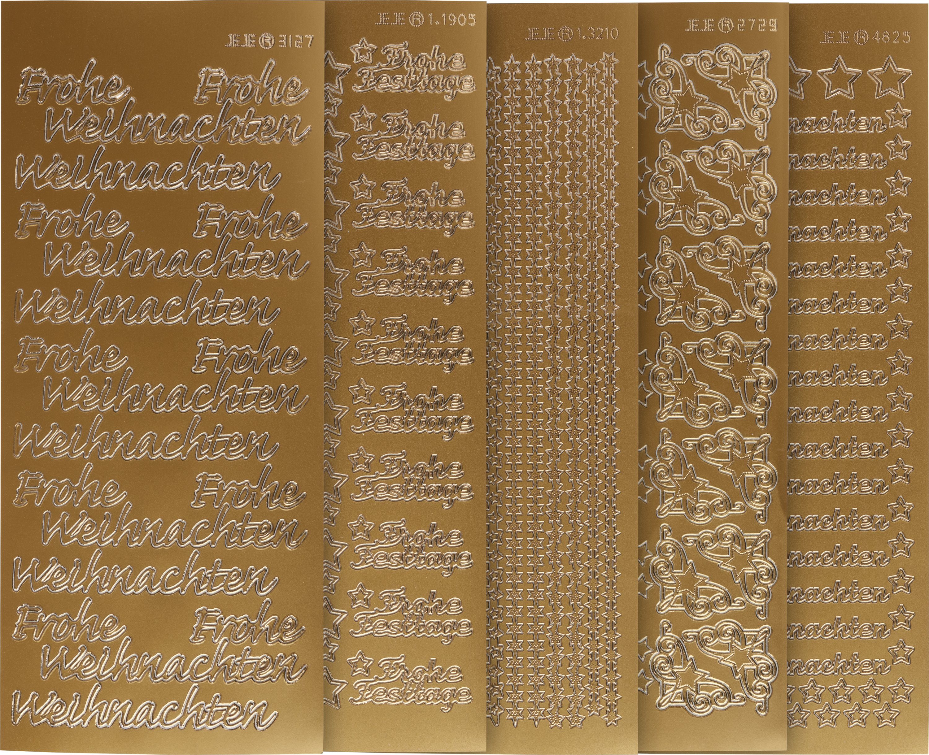 VBS Reliefsticker-Set 'Frohe Weihnachten', 5 Bogen mit weihnachtlichen Schriftzügen und Sternen in verschiedenen Ausführungen und Größen. Passend für die kreative Kartengestaltung und zum Verzieren von Anhängern sowie Geschenkverpackungen. Die Schriftzüge und Sterne in Form von Einzelsternen, Ecken und Banderolen lassen sich nach Belieben verbasteln und super mit Schleifenband, Streuteilen, Glitter und kleinen Weihnachtskugeln kombinieren.