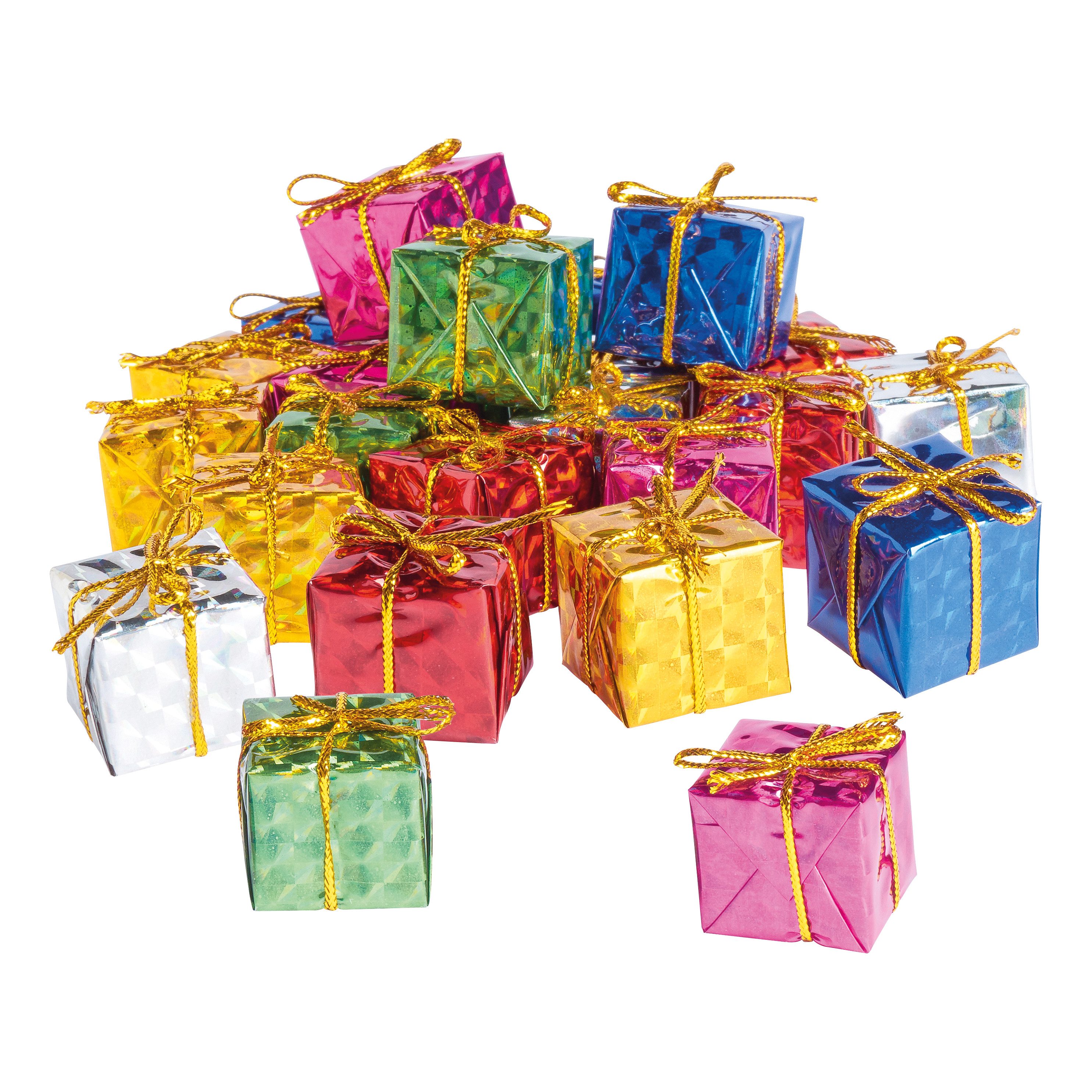 24 Deko-Geschenkpäckchen bun mit Glanzfolie umwickelten Styropor. Die Päckchen haben die Maße von jeweils ca. 2,2 cm Höhe, ca. 2,4 cm Breite und ca. 2,4 cm Tiefe.