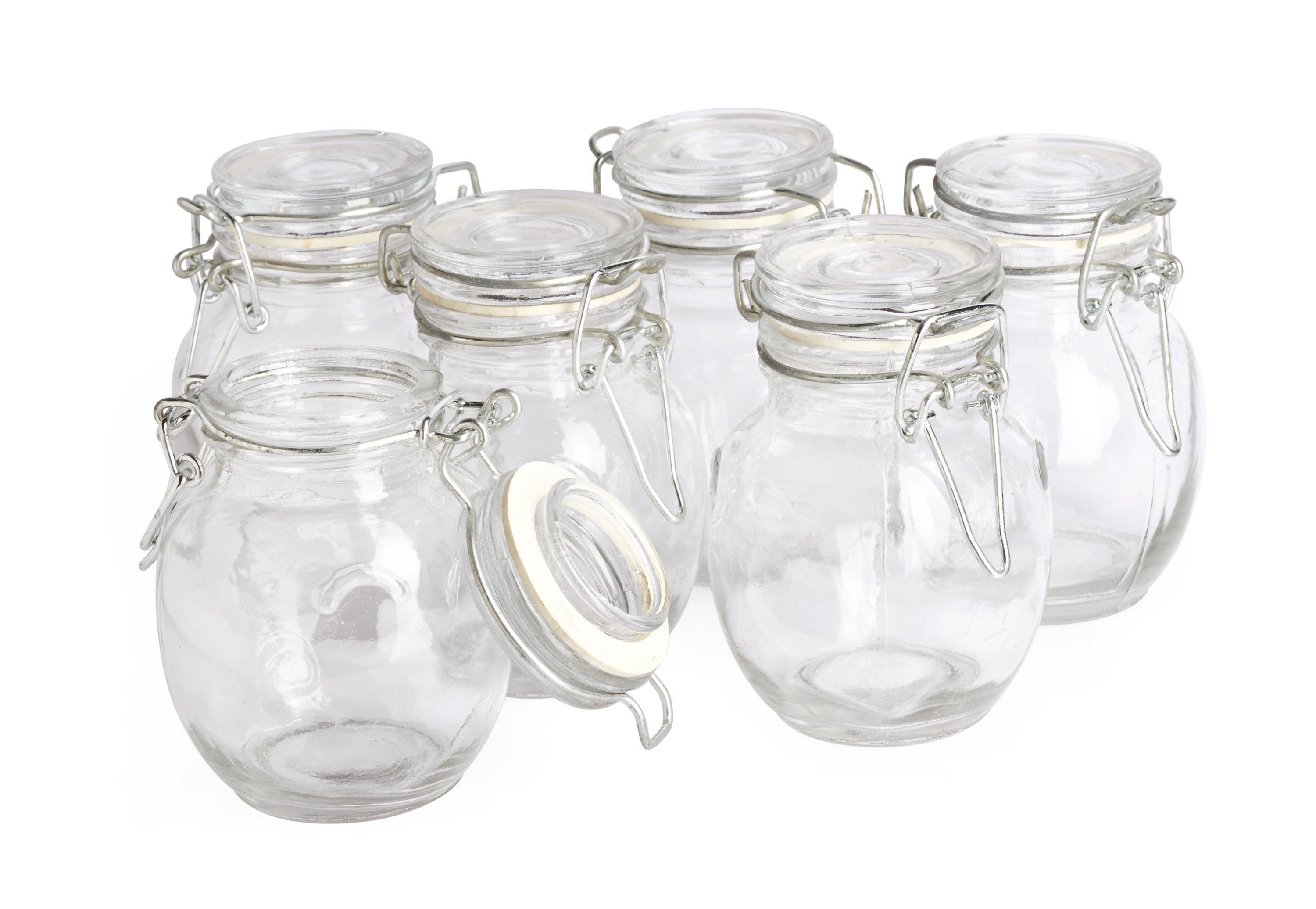 Mit der bauchigen Form, ca. 9 cm hoch, ca. Ø 6 cm sind die Gefäße aus Klarglas mit dem Metall-Bügelverschluss und Gummiring äußerst dekorativ und darüber hinaus sehr praktisch für die Aufbewahrung von vielen Kleinigkeiten.