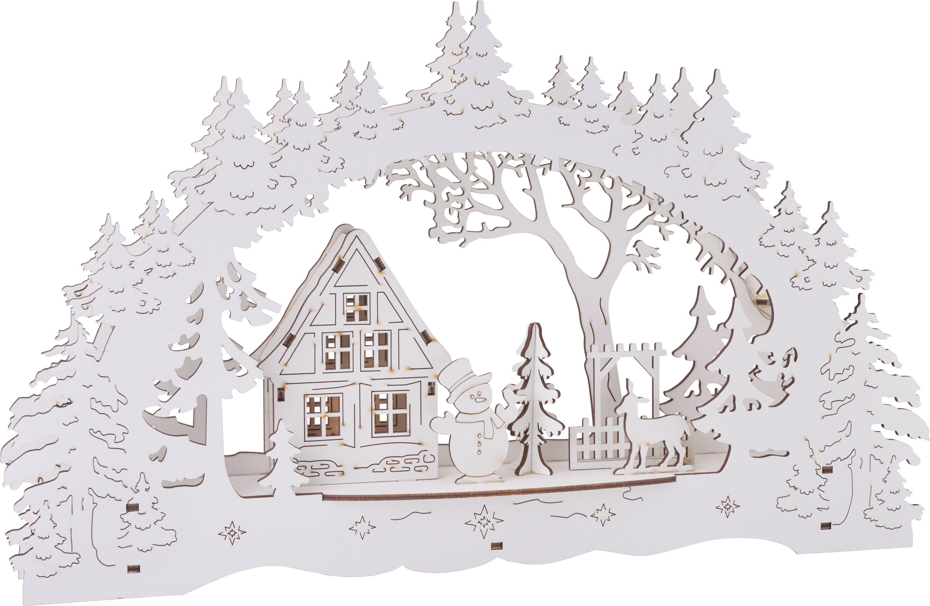 Dieser tolle VBS Lichterbogen 'Haus im Wald mit Schneemann', inkl. LED-Beleuchtung hat eine Размер von ca. 43,0 x 6,0 x 25,5 cm. Das Material ist Sperrholz, welches leicht Weiß grundiert ist. Der Lichterbogen ist eine schicke und harmonische Dekoration zur Advents-und Weihnachtszeit. Mit Acrylfarbe, Chalky-Color, Glitter oder Kunstschnee kann der Bogen nach eigenen Vorstellungen gestaltete werden. Für die Inbetriebnahme benötigen Sie 2 AA Batterien, diese sind nicht im Lieferumfang enthalten.