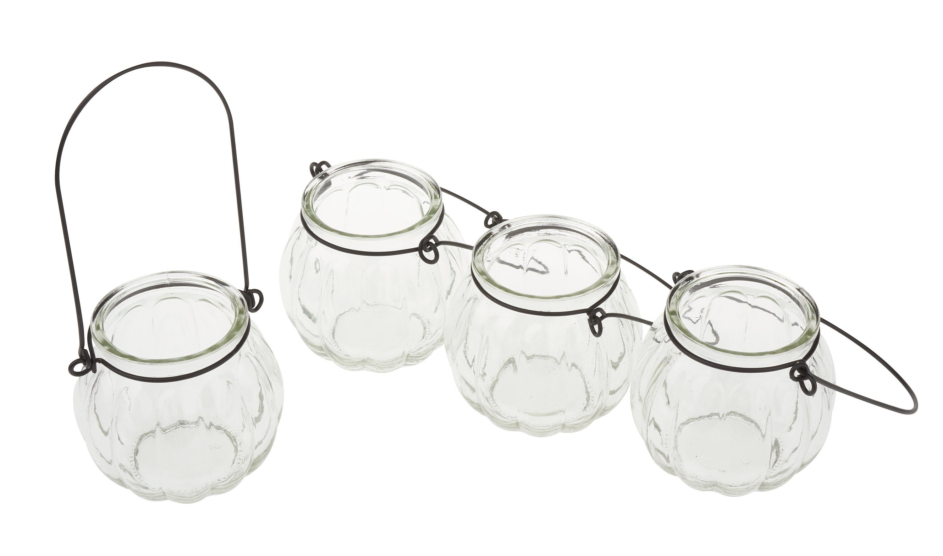 VBS Glas-Windlicht aus Klarglas mit schwarzem Metallbügel im 4er-Set. Das Windlichtglas hat jeweils eine Höhe von ca. 7,0 cm und einen Durchmesser von ca. 7,5 cm. Ideal für ein Teelicht oder floristische Dekorationen.