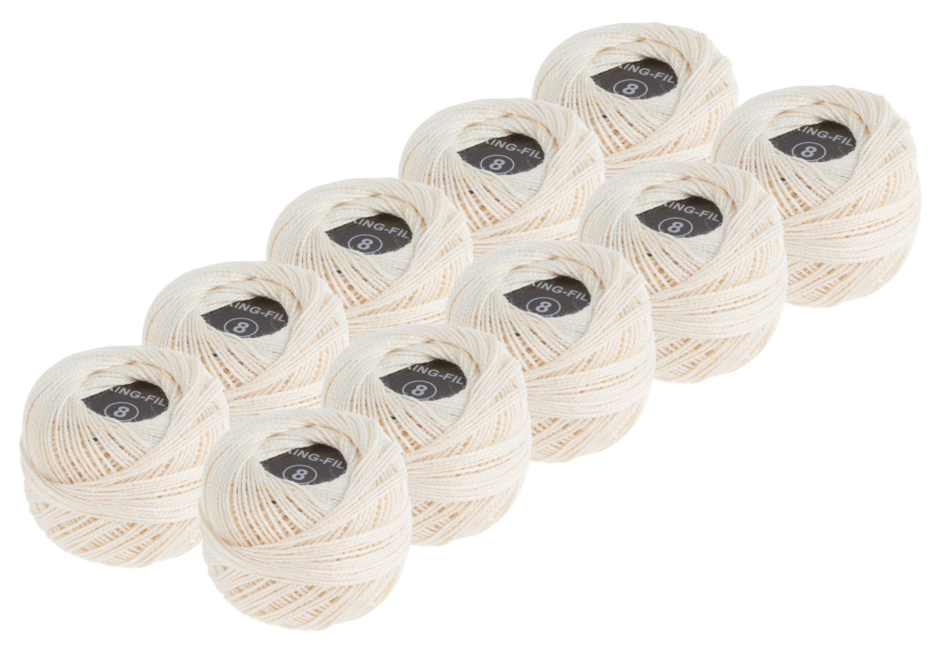 Das Häkelgarn in Creme hat pro Knäuel 30 Meter Lauflänge. Das Garn eignet sich gut zum Häkeln kleiner Spitzen oder Borten.