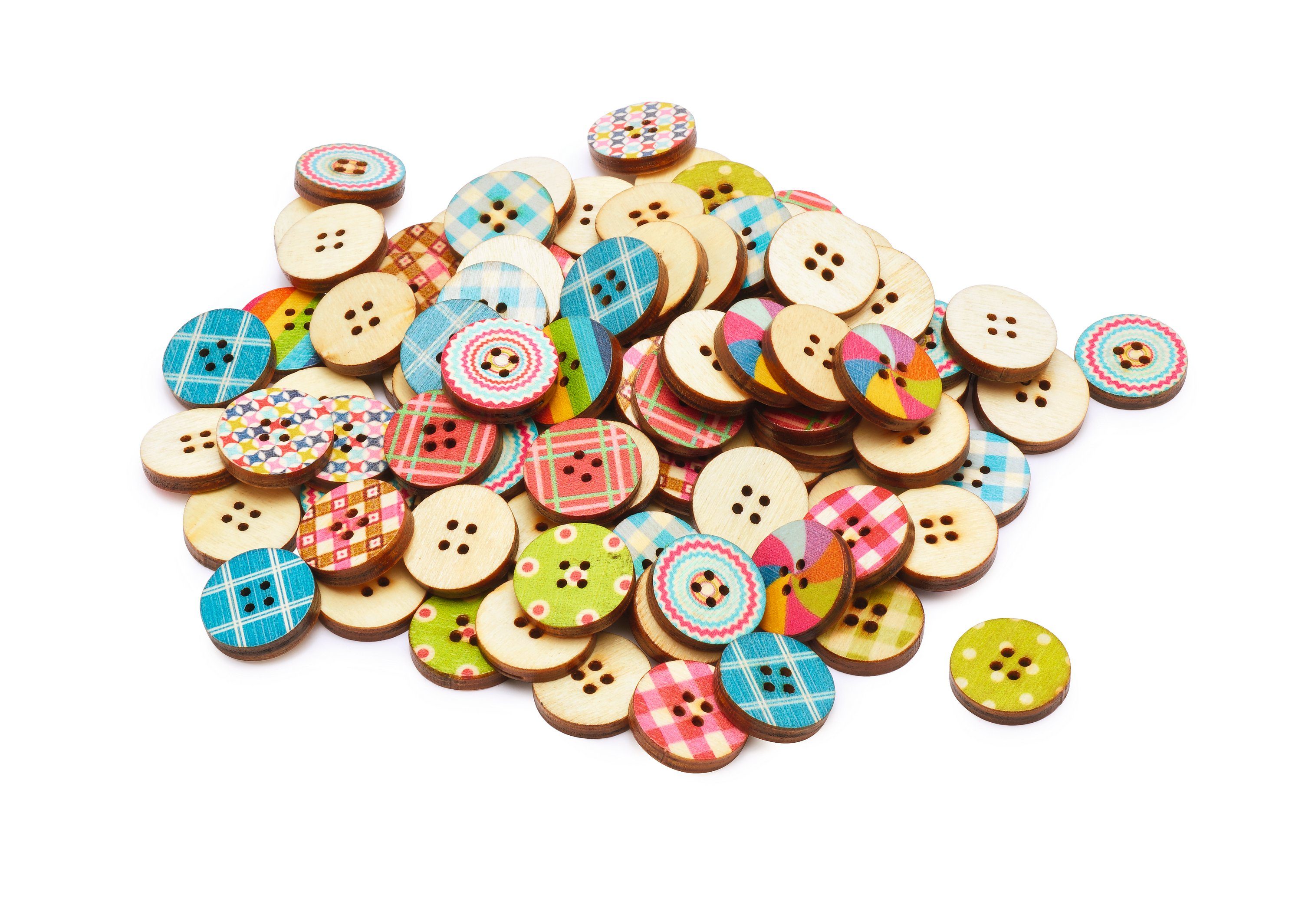 Mit 100 Stück und einem Ø von 2 cm in verschiedenen Mustern wie Kreisen, Karos, Streifen, Punkten und geometrischen Formen bieten sie unzählige Kombinationsmöglichkeiten. Die Knöpfe sind einseitig dekorativ bedruckt und eignen sich ideal zum Aufnähen und Dekorieren. Holzknöpfe sind zeitlos, nachhaltig und verleihen deinen Kreationen einen besonderen Charme. Zaubere einzigartige Lieblingsstücke mit den VBS Holzknöpfen 'Fashion-Mix'!