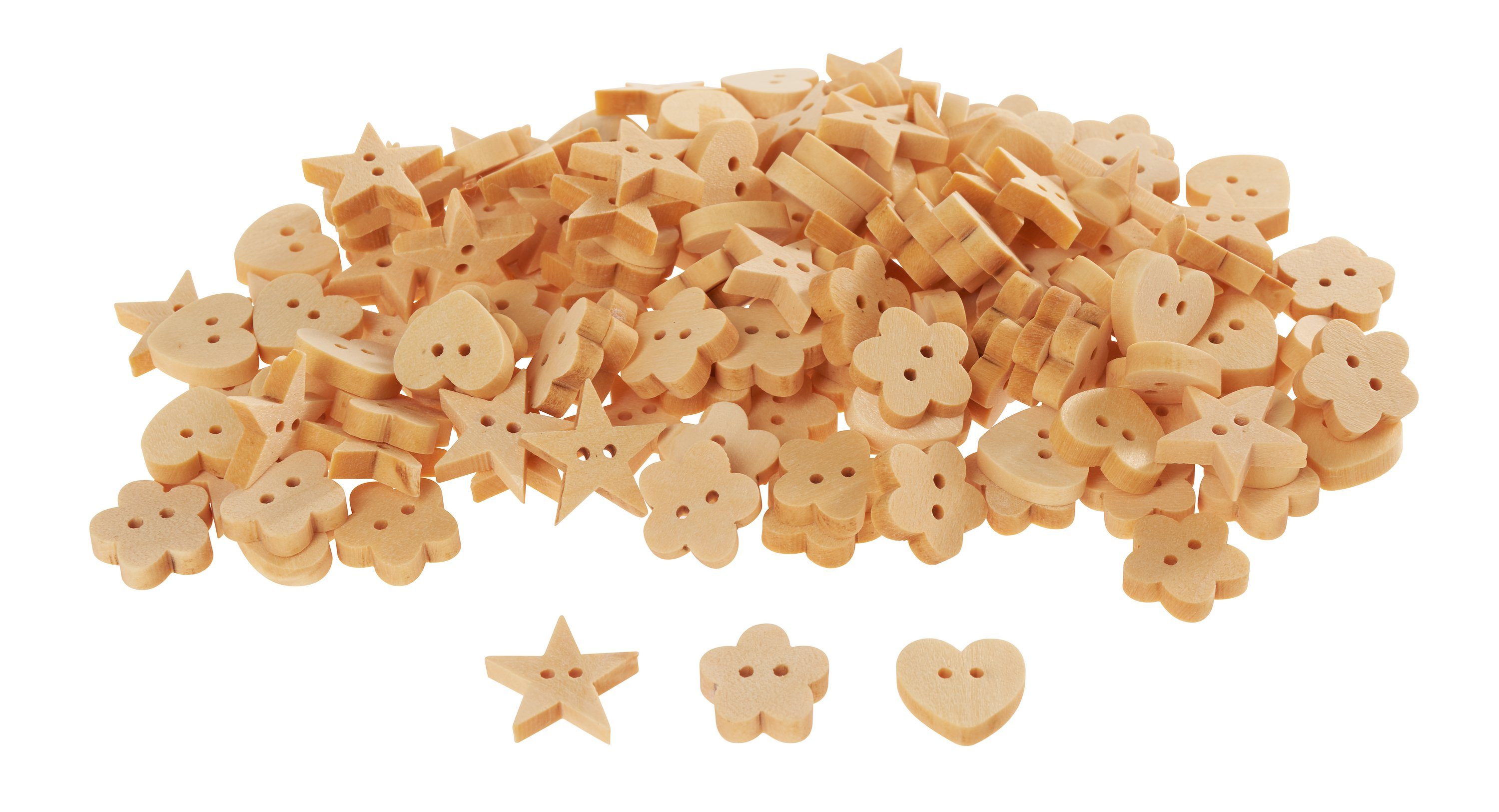 Wunderschöne VBS Holzknöpfe 'Motivmix'. Die Knöpfe haben eine Stärke von ca. 3 mm. Sie erhalten 150 Stück. Ideal für zahlreiche Dekorationen zum Aufnähen oder Ankleben.