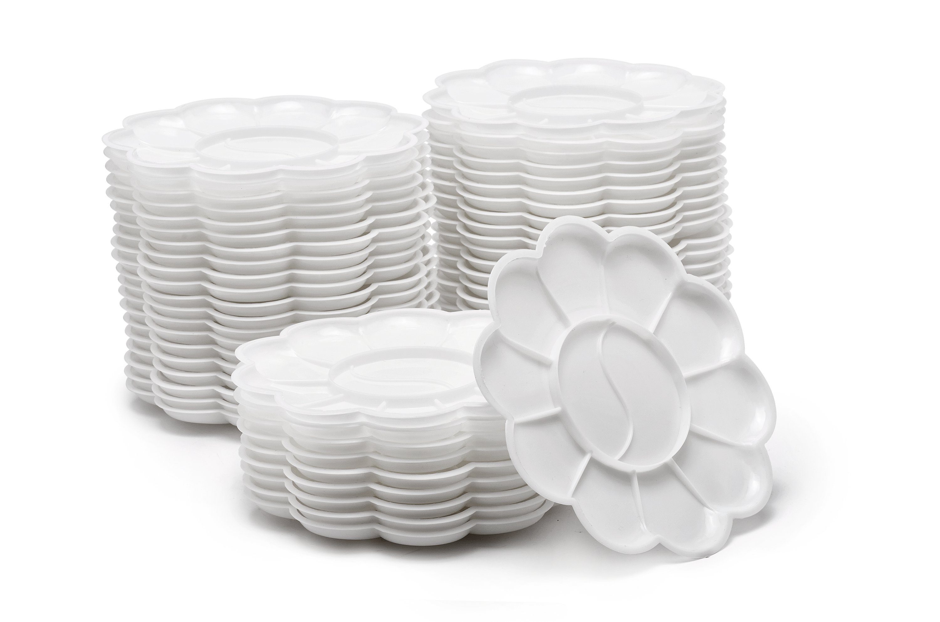 Mit diesen VBS Malpaletten als Großpackung sparen Sie in der Menge. Sie erhalten 50 weiße Malpaletten aus Kunststoff mit einem Ø von ca. 14,5 cm. Die Malpaletten liegen angenehm in der Hand und sind eine perfekte Hilfe bei dem Anmischen von Farben. Sie sind ausgestattet mit 12 flachen Mulden und glatter Oberfläche. Ideal für das umweltfreundliche Malen, da die Paletten sofort nach Gebrauch gereinigt immer wieder verwendet werden können.