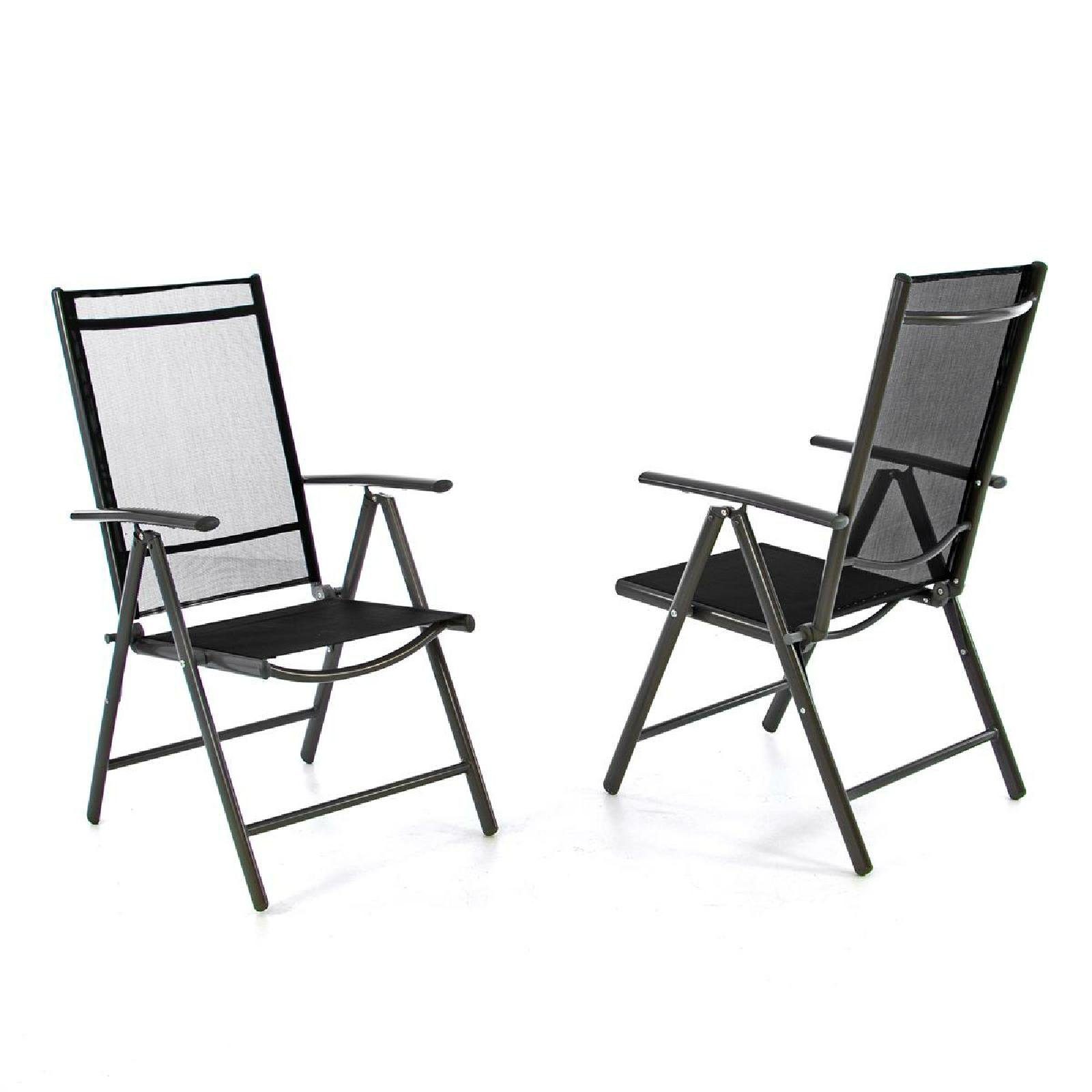 Angaben je Stuhl: Material: Aluminium und Textilene Gesamtgröße: ca. 56 (B) x 65 (T) x 105 (H) cm Sitzfläche: 43 x 44 cm Lehnenbreite: ca. 5 cm Rückenlehne: 65 cm Sitzhöhe: ca. 43 cm Höhe der Armlehne bis Boden: ca. 68 cm extrem leicht und sehr stabil Hochwertiges Textilene 1x1, 450g/m² Rahmen dunkelgrau / Textilene schwarz Belastbarkeit: ca. 110 kg 7-fach verstellbar