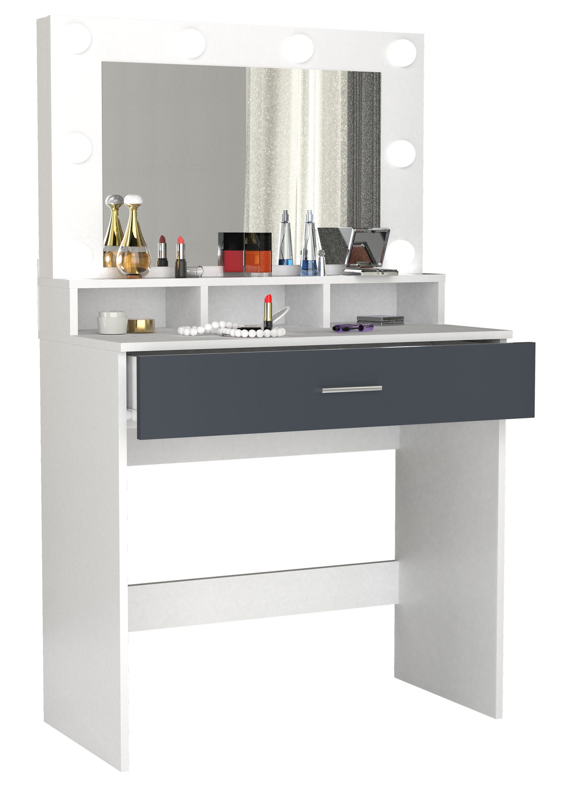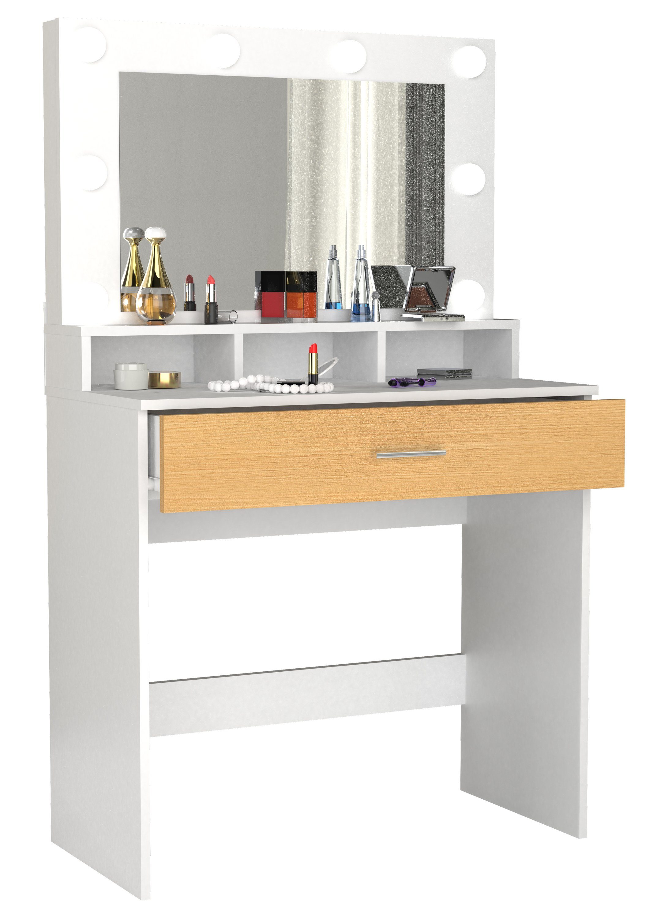 Im klassischen Design bietet der Schminktisch "Kosmal" mit drei offenen Fächern und einer großzügigen Schublade genug Platz für ihre Kosmetika. Durch die 8 Glühbirnen haben sie stehts genug Licht. Durch sein simples und schickem Design wertet er jedes Schlaf- oder Anrichtezimmer auf.
