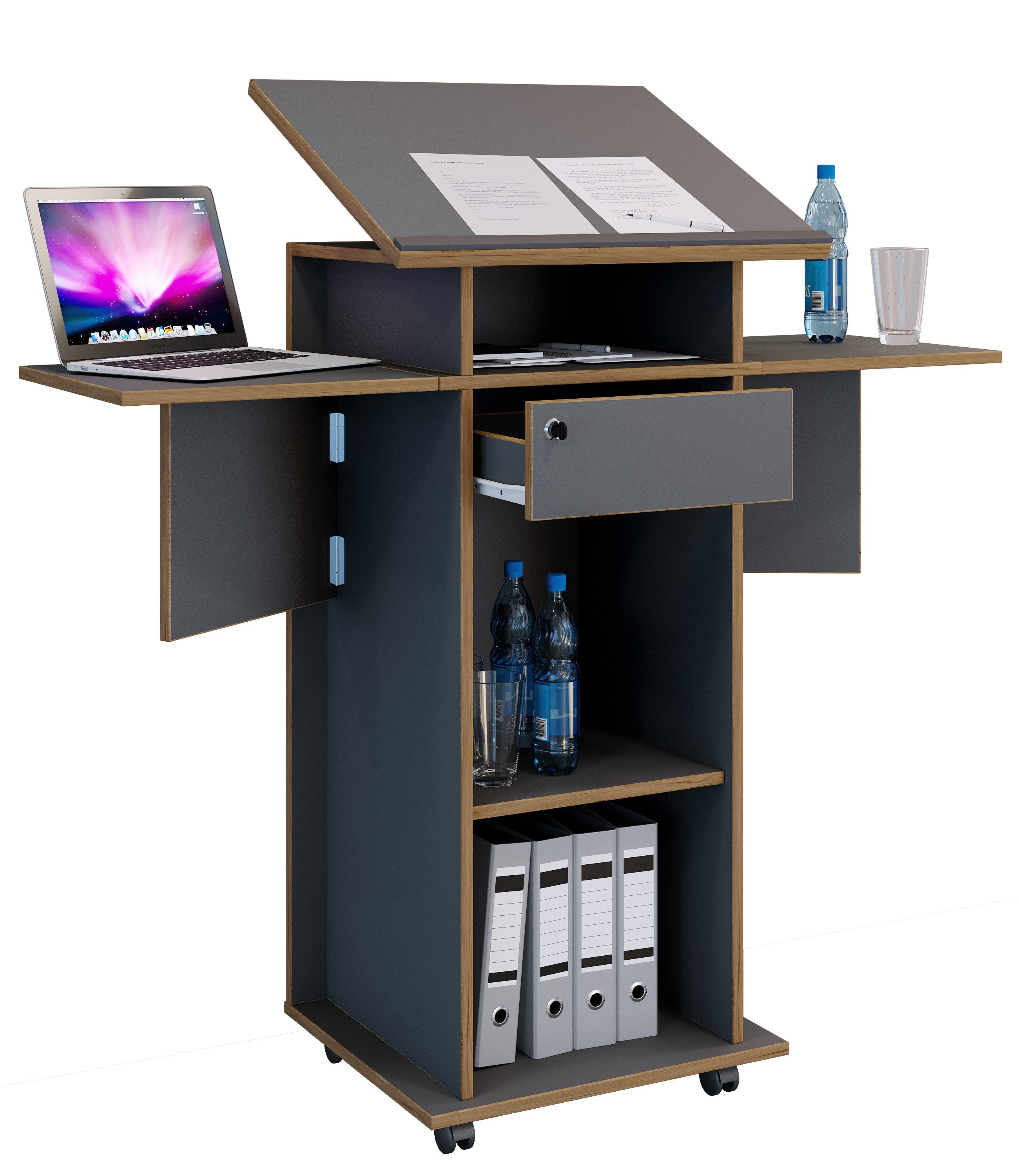 Highlights: - Maße Stehpult ca. H. 107 bis 128 cm x B. 60 bis 123 cm x T. 44 cm - Maße neigbare Rednerplatte ca. Breite 60 cm x Tiefe 50 cm - Eine abschließbare Schublade (ca. H. 14 x. B. 35 T. 35 cm) - Die äußeren Seitenteile können platzsparend heruntergeklappt werden - Vier Laufrollen sorgen für Mobilität