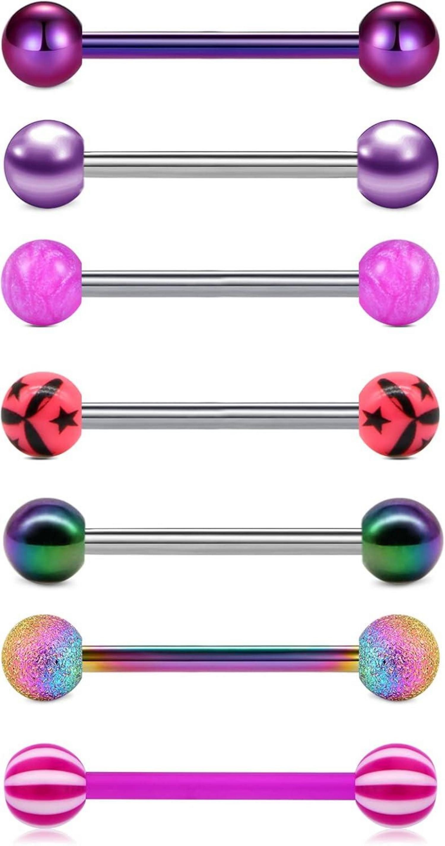 Das Set besteht aus sieben Zungenpiercings, die in einem schönen Samtbeutel geliefert werden. Der Stab hat eine Stärke von 14G (1,6mm) und die Kugeln haben eine Размер von 5mm. Hergestellt aus hochwertigem 316L Chirurgenstahl und Plastik, bietet dieses Set nicht nur Stil, sondern auch Komfort. Das Zungenpiercing-Set wird in China produziert und ist aus korrosionsbeständigem Edelstahl gefertigt.