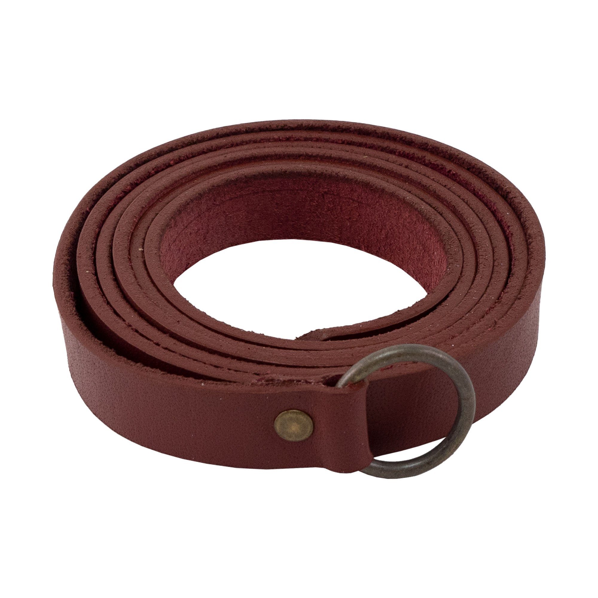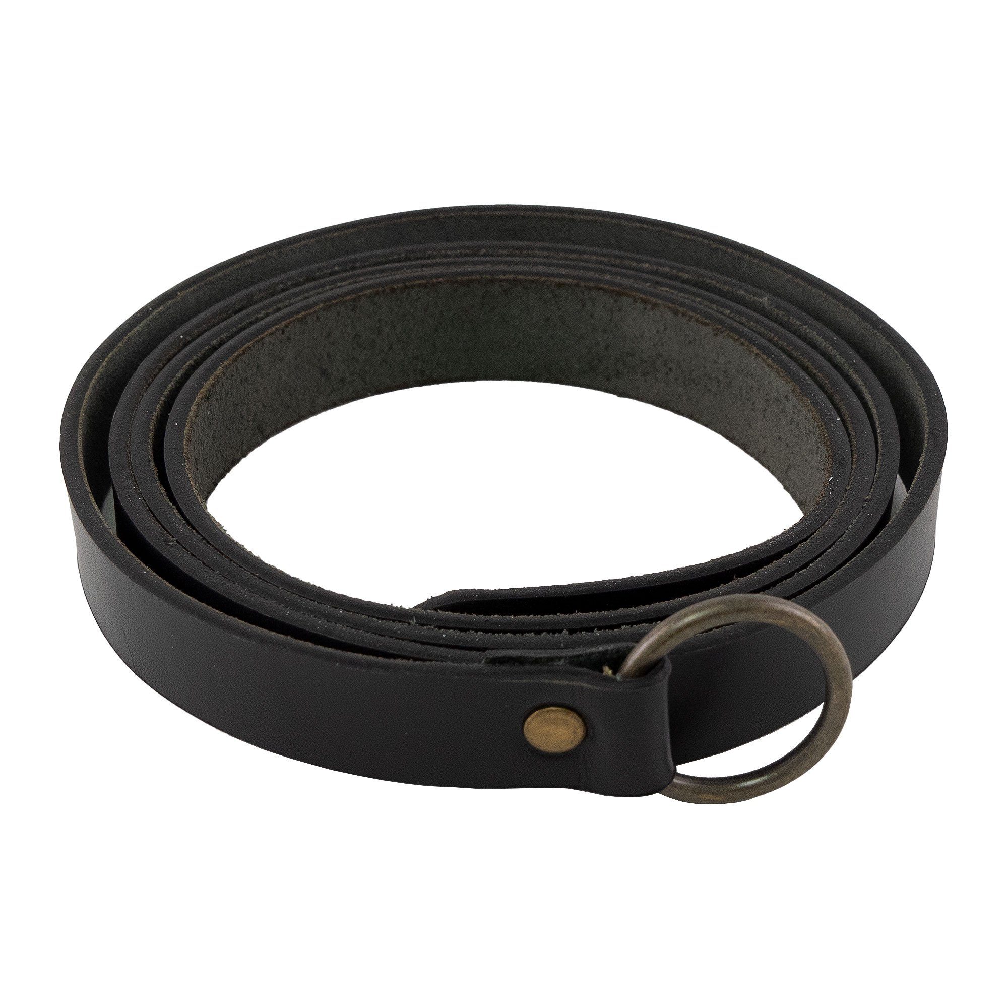 Dieser mittelalterliche Langgürtel aus Leder ist mit einem Eisenring versehen, der dafür bestimmt ist, dass man das Ende des Gürtels durch den Ring zieht und anschließend verknotet. Das Ende hängt dann locker nach unten, wodurch ein einfacher Look entsteht, der das Outfit aber dennoch aufwertet.