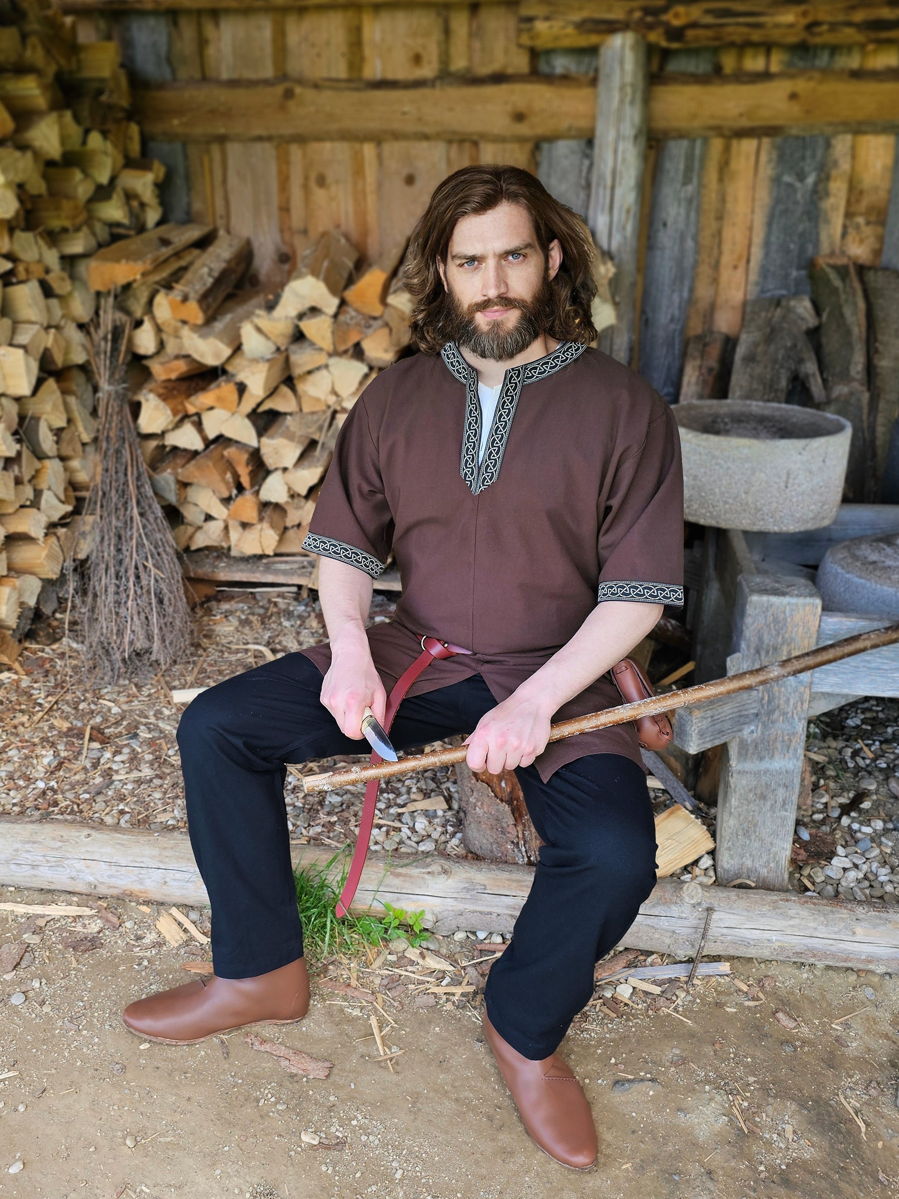 Unsere klassische Wikinger Tunika braun mit Knotenmuster ist durch ihren längeren Schnitt und der Bordüre gut geeignet für die Wikinger Darstellung. Die braune Wikingertunika ist aus Baumwolle gefertigt und sehr angenehm zu tragen. Die schöne Borte mit Knotenmuster ist ebenfalls aus Baumwolle gearbeitet. Sie ist am Halsausschnitt sowie an den Ärmelenden angebracht und rundet die Kurzarmtunika ab. Das Knotenmuster ist typisch für das Früh- und Hochmittelalters und passt somit gut zur wikingerzeitlichen Darstellung. Die Tunika hat einen Schlitz am Halsausschnitt, um das An- und Ausziehen zu erleichtern. Dieser Schlitz könnte mit einer Wikinger Fibel geschlossen werden und so das Wikinger Outfit erweitern. Im Schrittbereich sind ebenfalls Schlitze an der Vorder- und Rückseite eingearbeitet, um so für mehr Beinfreiheit zu sorgen. Die Ärmel sind kurz, wobei die Wikinger Tunika aber nicht nur im Sommer getragen werden kann. Zieht man z.B. eine langärmelige Untertunika drunter, ist sie auch für kältere Tage geeignet.