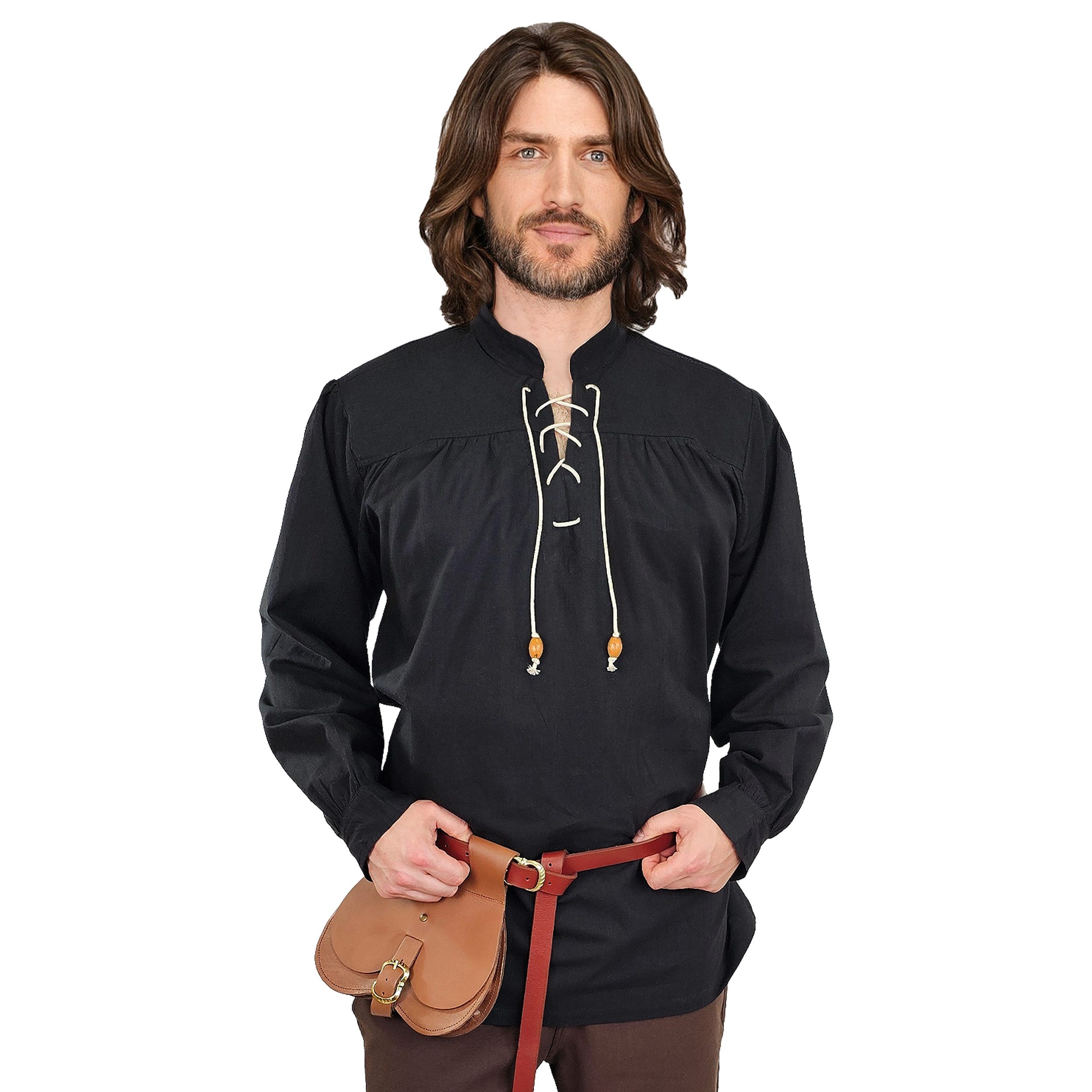 Unser klassisches Mittelalter Hemd oder Schnürhemd schwarz ist aus Baumwollstoff hergestellt, welcher angenehm auf der Haut liegt. Das Mittelalter Hemd ist locker geschnitten, wodurch es einen guten Sitz und gleichzeitig den typisch mittelalterlichen Look erhält. Mittelalterkleidung ist bekannt für solch einen Schnitt, da dies zum mittelalterlichen Look gehört. Der Stoff ist an den oberen Schulterteilen, sowie an den Ärmeln leicht gerafft. Die Ärmel sind lang und enden mit einer Manschette (ohne Knöpfe). Das Mittelalterhemd hat einen Stehkragen und am Halsausschnitt einen Schlitz, welcher mit einem naturfarbenen Band geschnürt werden kann. Das Baumwollband hat an beiden Enden eine kleine Holzperle, was dem Hemd ein noch edleres Aussehen verleiht.