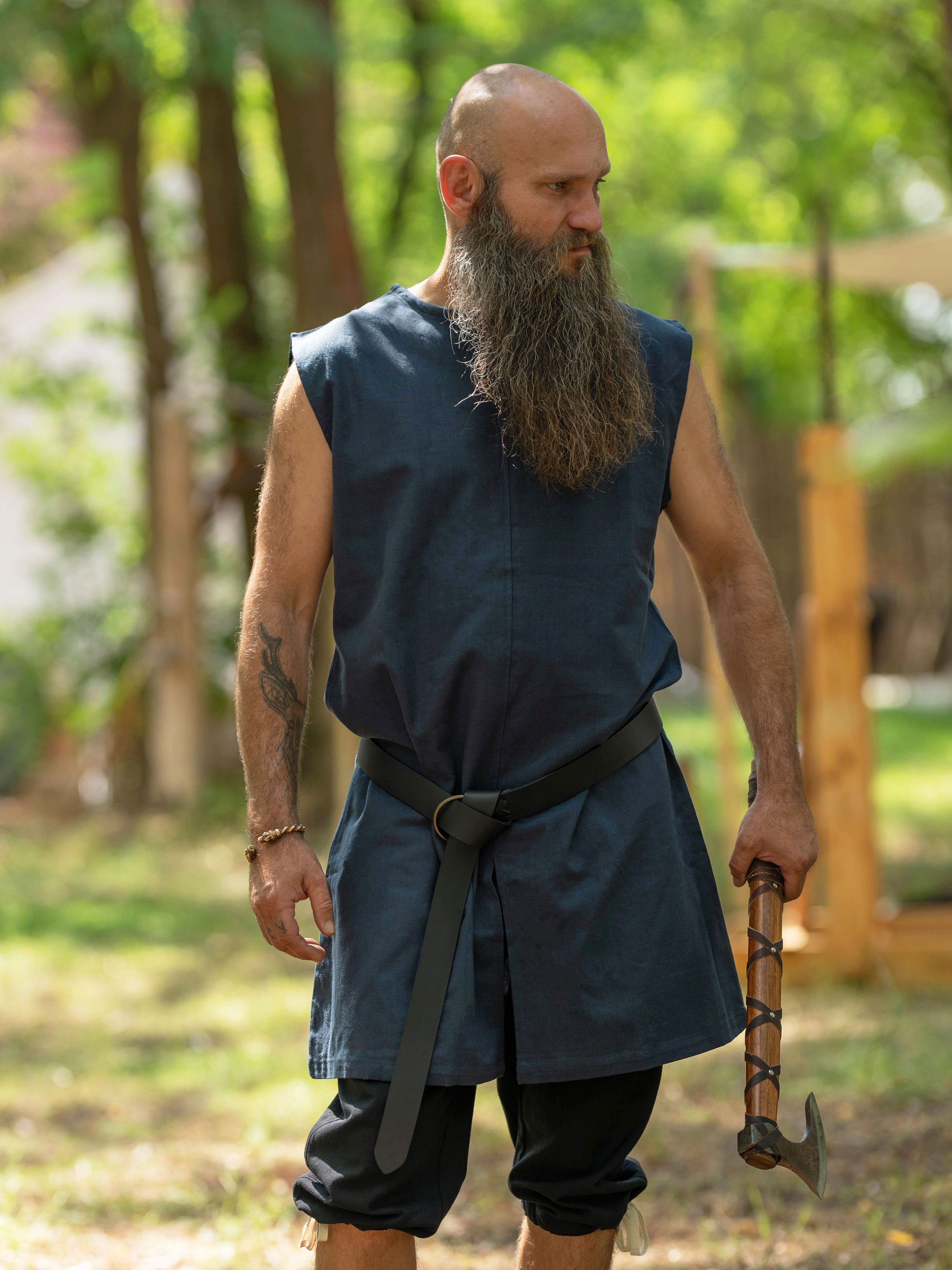 Die ärmellose blaue Mittelaltertunika aus 100% Baumwolle ist ein vielseitiges Kleidungsstück. Der schöne Baumwollstoff sorgt für einen hohen Tragekomfort und ist für warme Tage und verschiedene Anlässe, wie Mittelaltermarkt, Larp-Veranstaltungen oder Faschingsfeste gut geeignet.