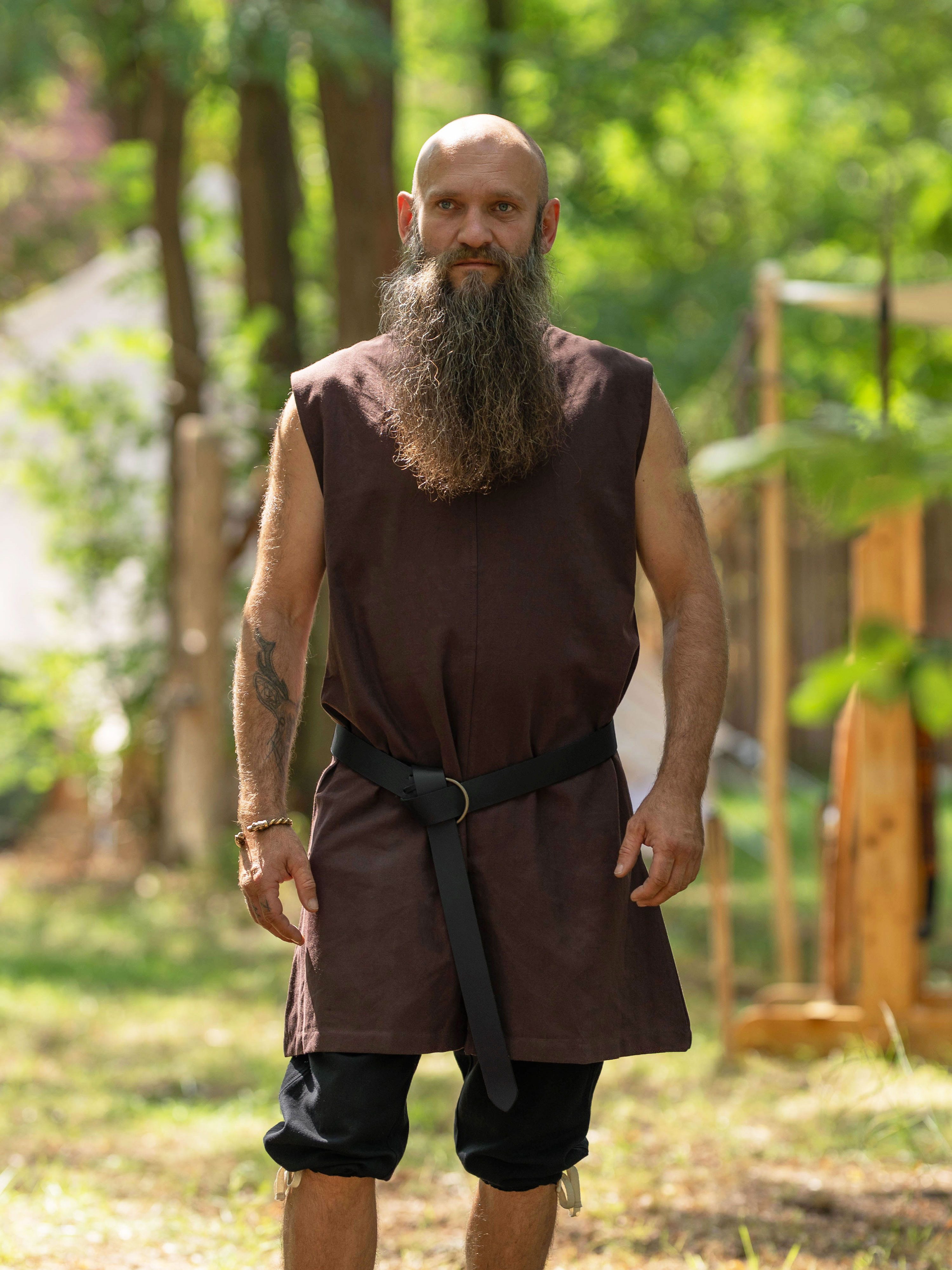 Die ärmellose braune Mittelaltertunika aus 100% Baumwolle ist ein vielseitiges Kleidungsstück. Der schöne Baumwollstoff sorgt für einen hohen Tragekomfort und ist für warme Tage und verschiedene Anlässe, wie Mittelaltermarkt, Larp-Veranstaltungen oder Faschingsfeste gut geeignet.