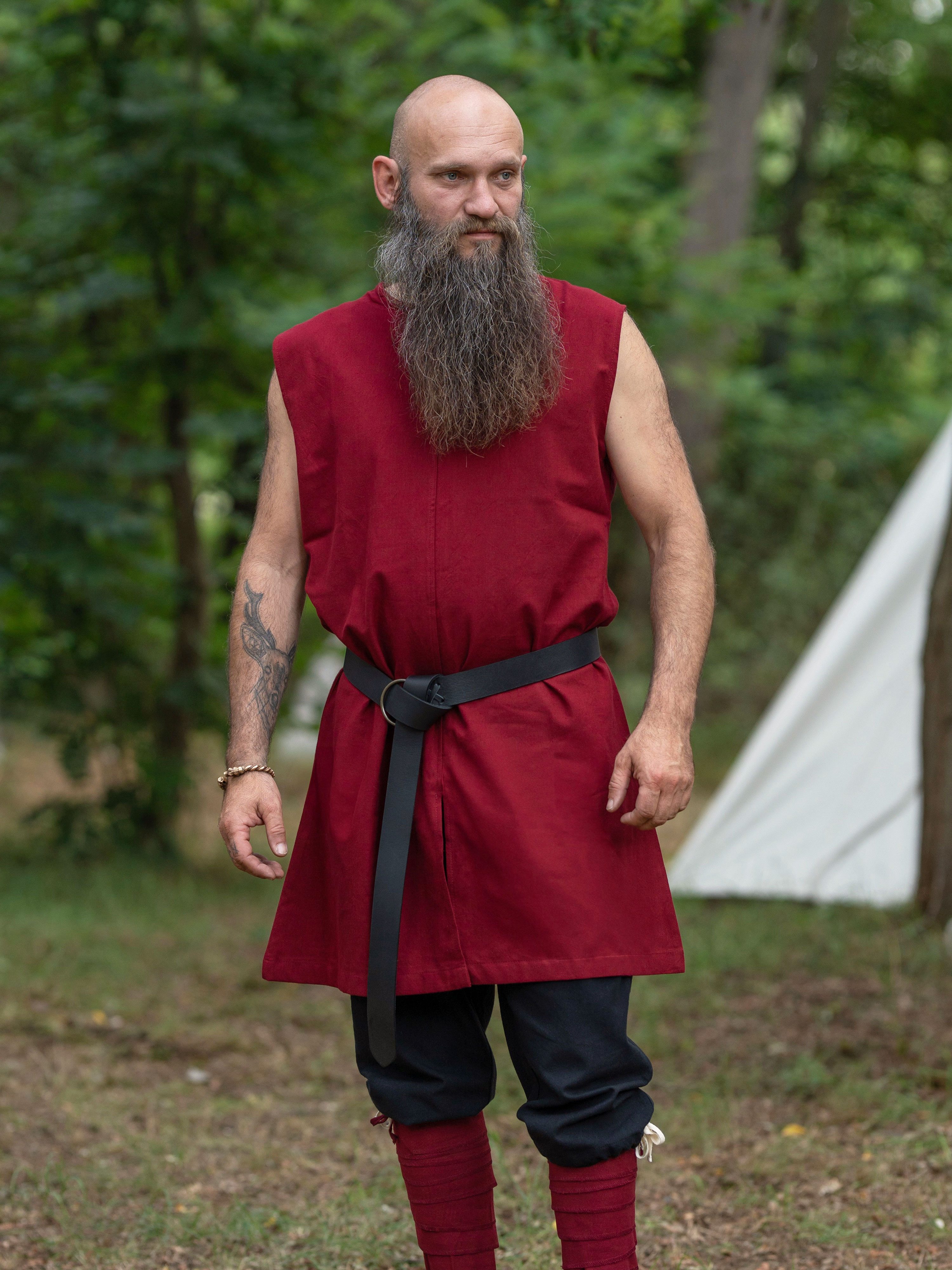 Die ärmellose rote Mittelaltertunika aus 100% Baumwolle ist ein vielseitiges Kleidungsstück. Der schöne Baumwollstoff sorgt für einen hohen Tragekomfort und ist für warme Tage und verschiedene Anlässe, wie Mittelaltermarkt, Larp-Veranstaltungen oder Faschingsfeste gut geeignet.