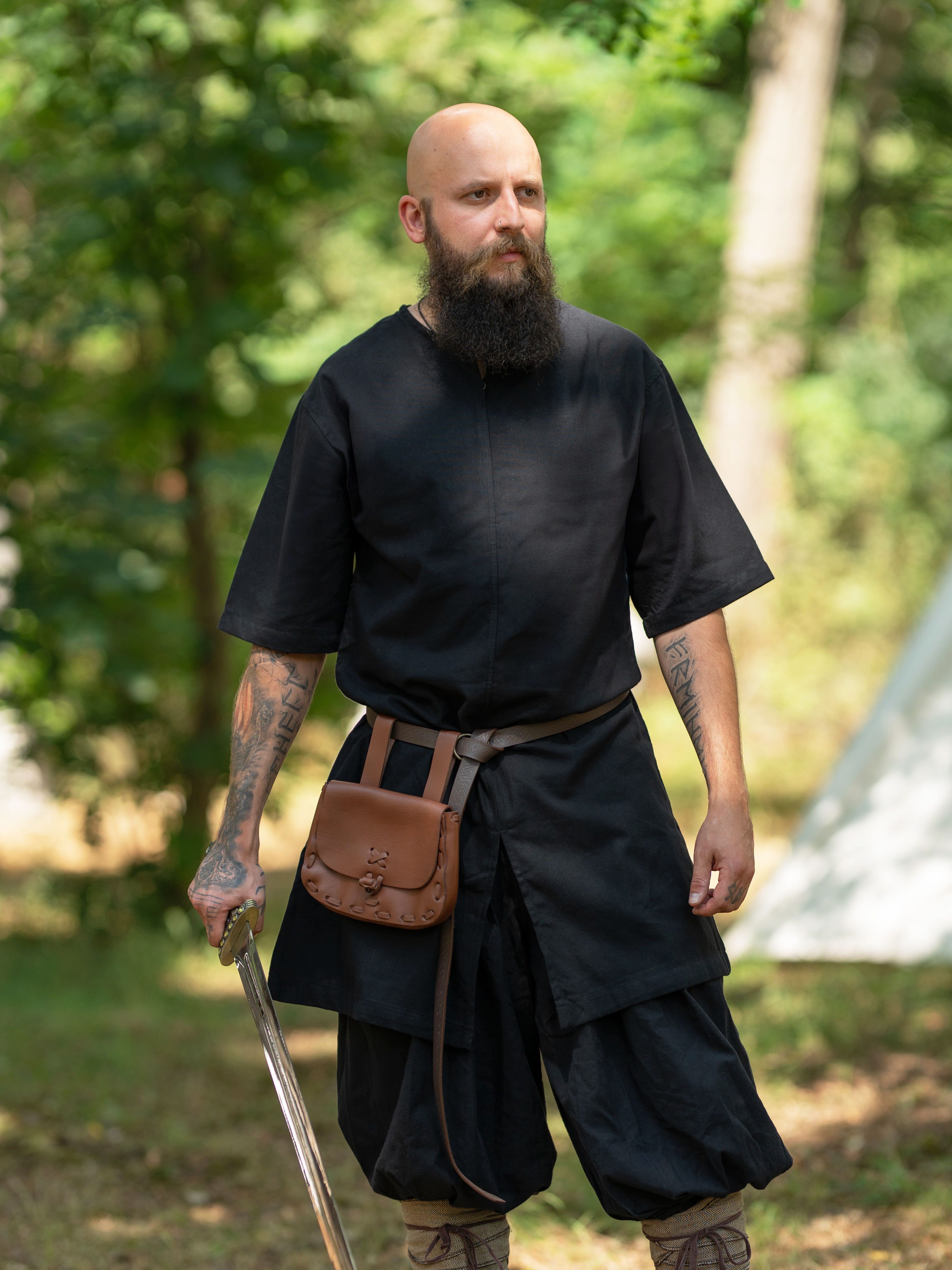 Die schwarze Kurzarmtunika ist ein schönes und vielseitiges Kleidungsstück. Aus 100% Baumwolle gefertigt, sorgt der Stoff für hohen Tragekomfort. Der Halsausschnitt ist mit einem Schlitz versehen, welcher mit einer Fibel geschlossen werden könnte. Die Tunika ist nach unten hin weiter geschnitten, was für eine bequeme Trageform sorgt. Außerdem sind am Saum auf der Vorder- und Rückseite Schlitze eingearbeitet, welche die Bewegungsfreiheit erhöhen.
