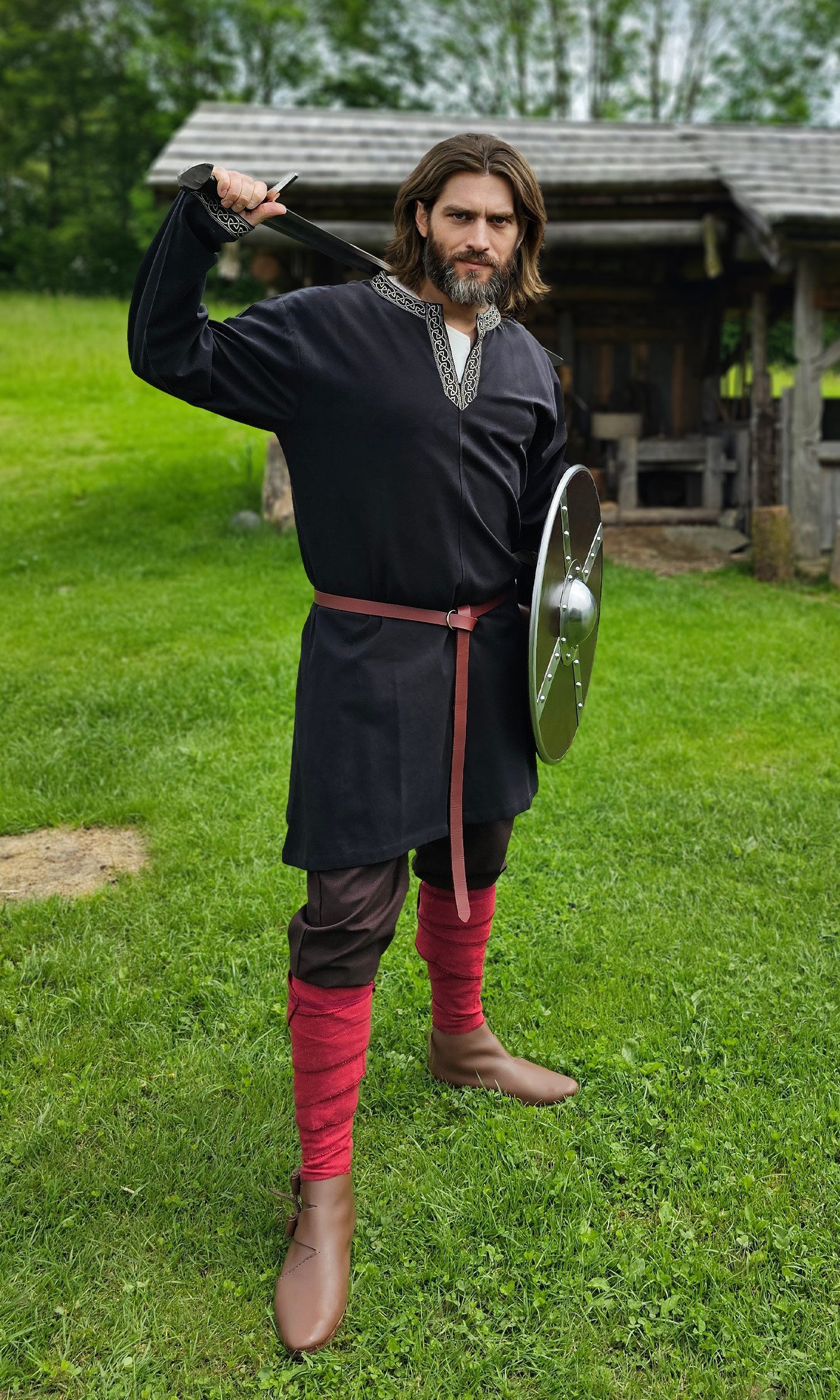 Die Wikinger Tunika ist gut geeignet für die Wikinger Darstellung. Auf den ersten Blick fällt die Bordüre ins Auge. Das Knotenmuster ist typisch für die Wikingerzeit und passt gut als Abschluss für den Halsausschnitt sowie die Ärmelenden der langen Ärmel. Der nach unten weiter werdende Schnitt ist typisch für eine Wikingertunika. Der Schlitz am Dekolleté vereinfacht das An- und Ausziehen, kann dann offen oder mit einer Fibel geschlossen getragen werden. Die unteren Schlitze sind an Vorder- und Rückseite eingearbeitet, welche für mehr Beinfreiheit zu sorgen. Unsere Wikinger Tunika ist aus Baumwolle gefertigt, wodurch der Stoff sehr angenehm zu tragen ist, die Borte besteht ebenfalls aus Baumwolle.