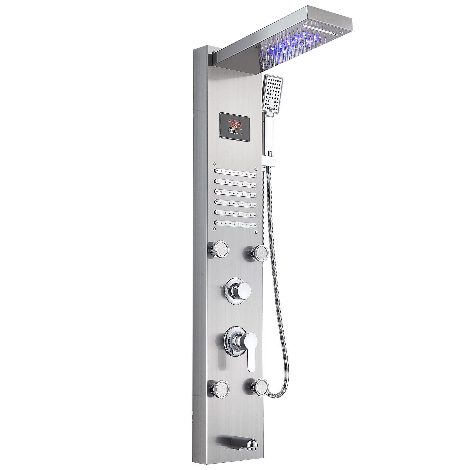 BenutzerfreundlichkeitAuf dem Duschpaneel gibt es von oben nach unten 2 Duschdrehknöpfe. Drehen Sie den oberen Schalter, um das Brausen zu aktivieren und die Ausflussfunktion zu steuern; Drehen Sie den unteren Knopf, um Temperatur und Wassermenge zu regeln. Multifunktions-Panel – Das Duschpaneel bietet verschiedene Funktionen: Entspannen Sie sich nach einem anstrengenden Arbeitstag und genießen Sie beim Duschen alle verfügbaren Modifikationen.