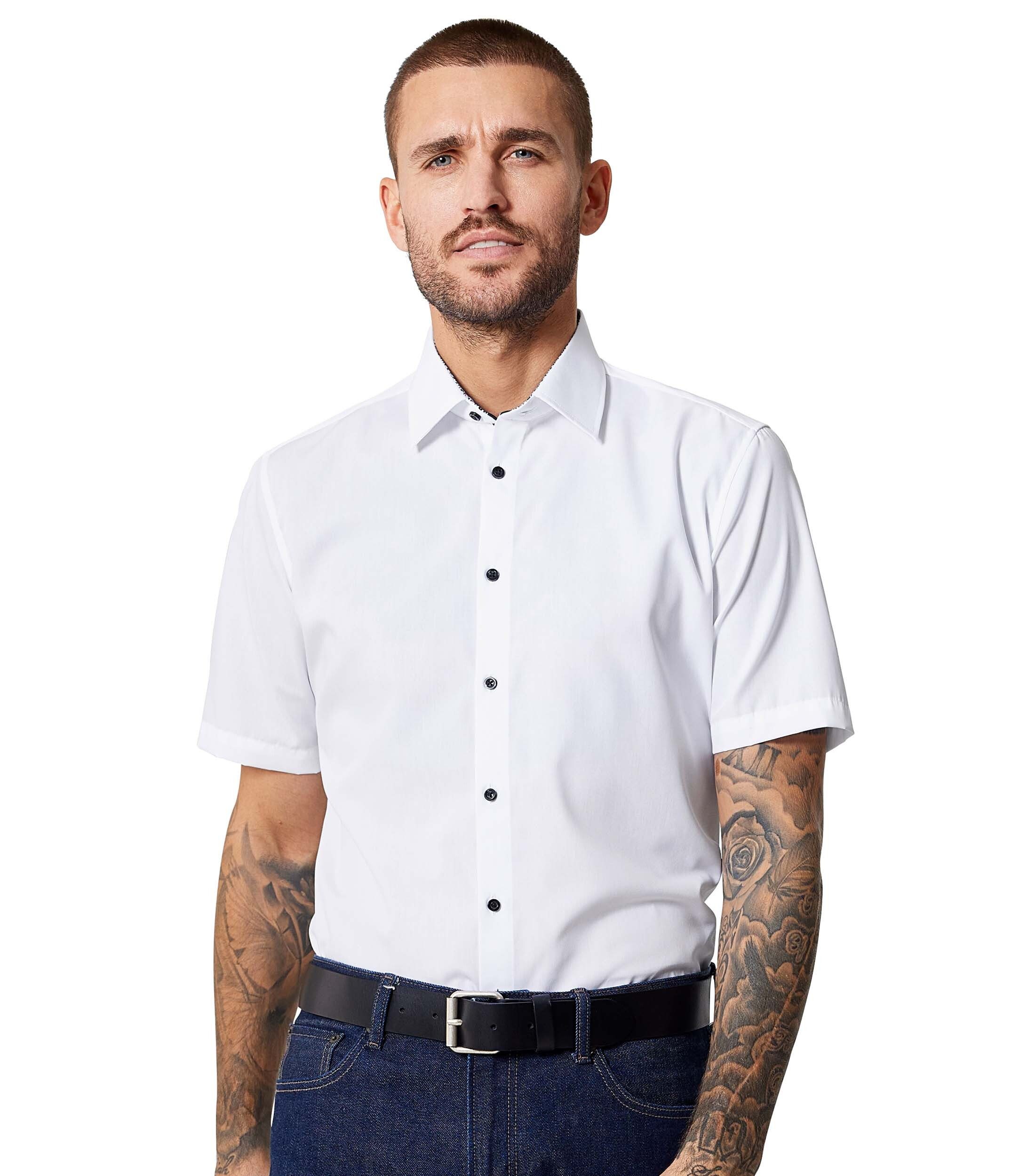 Besonderheiten: Hoher Tragekomfort Eigenschaften: bügelfrei Herstellerpassform: Modern Fit Materialzusammensetzung: 100 % Baumwolle Kragenform: Kent-Kragen Muster: uni Armlänge: Kurzarm Produktart: Businesshemd Kurzarm Pflegehinweise: Schonwaschgang 40 °C, nicht bleichen, Nicht im Wäschetrockner trocknen, Mäßig heiß bügeln, Professionelle Trockenreinigung normaler Prozess, Professionelle Nassreinigung schonender Prozess Produktvariante: Popeline Stil: Modern Taschen: Keine