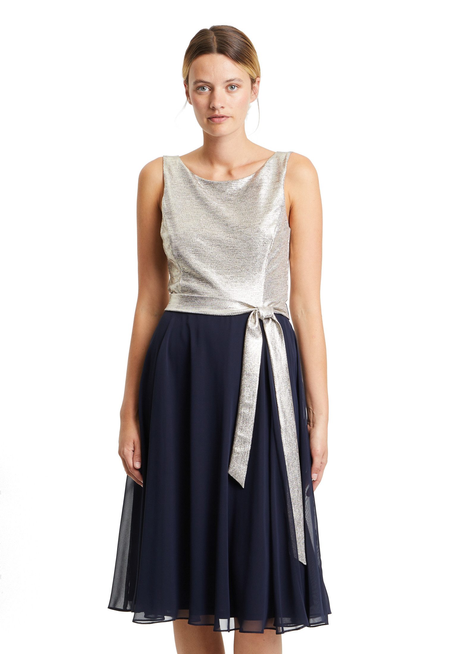 Ein absolutes Basic Must-Have ist dieses knieumspielende Cocktailkleid aus dem Hause Vera Mont! Das ärmellose Kleid besitzt einen Rundhalsausschnitt sowie einen Gürtel, der Ihre Taille gekonnt in Szene setzt und eine schöne, feminine Figur zaubert. Die Hauptbesonderheit des Kleides ist der Materialmix, durch den der Rock besonders schwingend verläuft. Das Cocktailkleid einen kaum sichtbaren Reißverschluss auf der Rückseite.