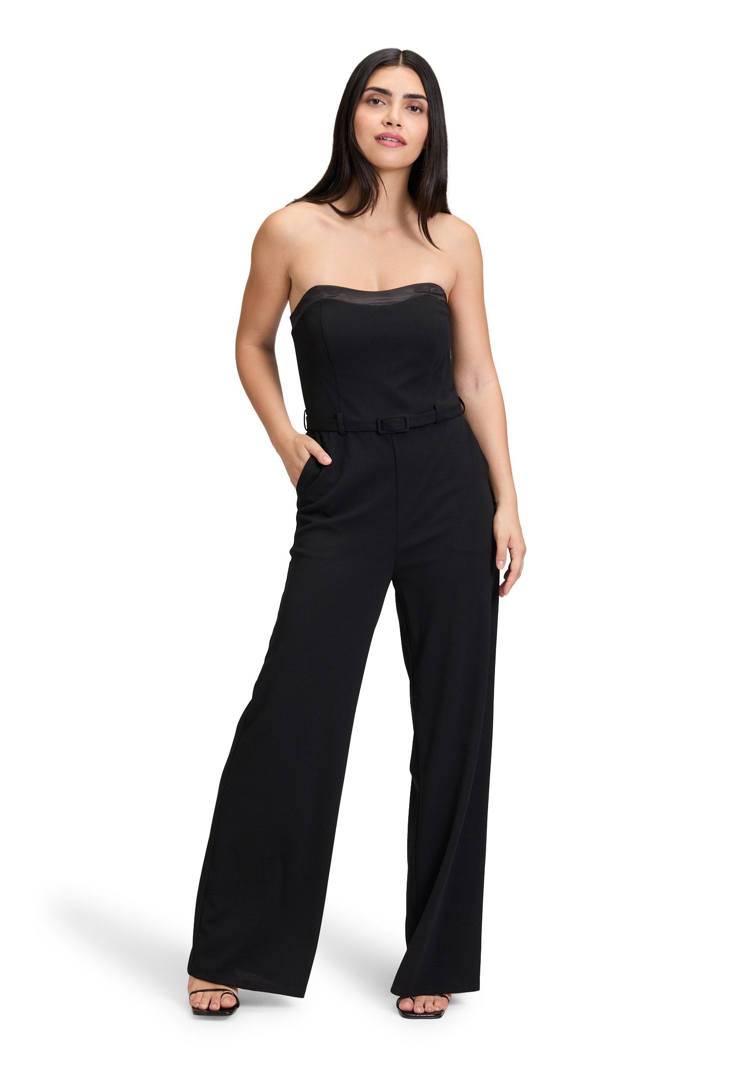 Zeitlos schön: Ein Modeklassiker, der in Ihrem Kleiderschrank nicht fehlen sollte.Der hochwertige Materialmix sorgt für einen edlen Look und angenehmen Tragekomfort – ideal für festliche Anlässe. Der moderne Fit mit durchdachter Nahtführung schmeichelt der Figur und bietet gleichzeitig Bewegungsfreiheit. Das unifarbene Design macht den Jumpsuit vielseitig kombinierbar – ob elegant oder modern gestylt. Feine Details wie eine Blende mit Schnallen, Reißverschluss, Gummizug und praktische Eingrifftaschen unterstreichen Komfort und Stil. Ein stilvoller Begleiter für besondere Momente mit modischem Anspruch.