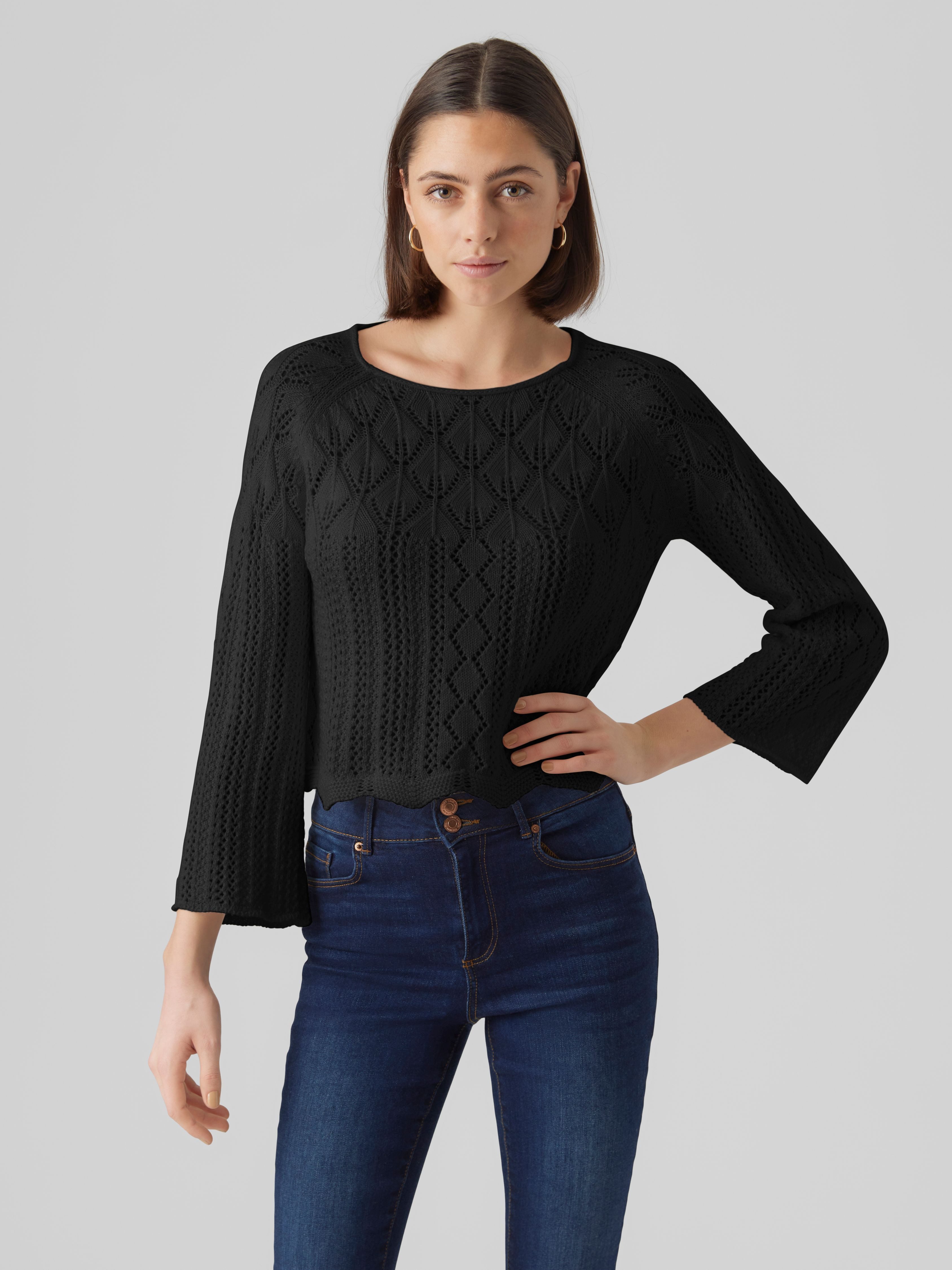 Der Strickpullover von Vero Moda wird dein neues Feel-good-Oberteil für zu Hause und an kalten Tagen. Die 3/4- Raglanärmel haben vom Halsausschnitt bis zur Achselhöhle eine schräg verlaufende Naht, die die Schulterpartie umfasst und somit zu den überschnittenen Ärmeln zählt. Dieser Pullover hat einen U-Boot-Ausschnitt mit Rollkante und ist hüftlang.