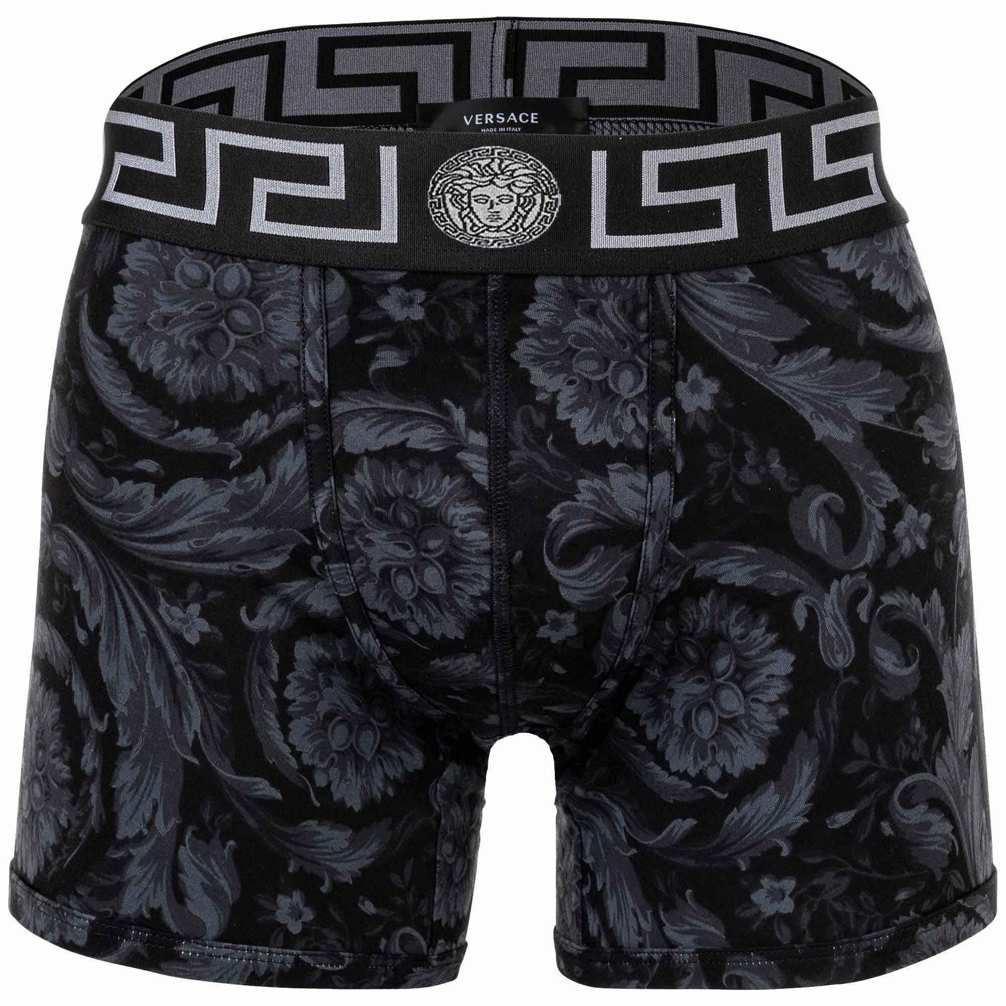Elegante Herren Boxer Shorts der Marke VERSACE. Hochwertige Unterhosen mit Allover Barocco Print. Ikonisches Greca-Muster und Medusa-Motiv am elastischen Bund.