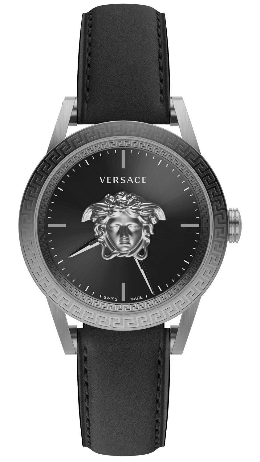 Das schwarze Zifferblatt enthält eine analoge Anzeige, silberne Indizes und Zeiger sowie das Versace-Logo in der Mitte.