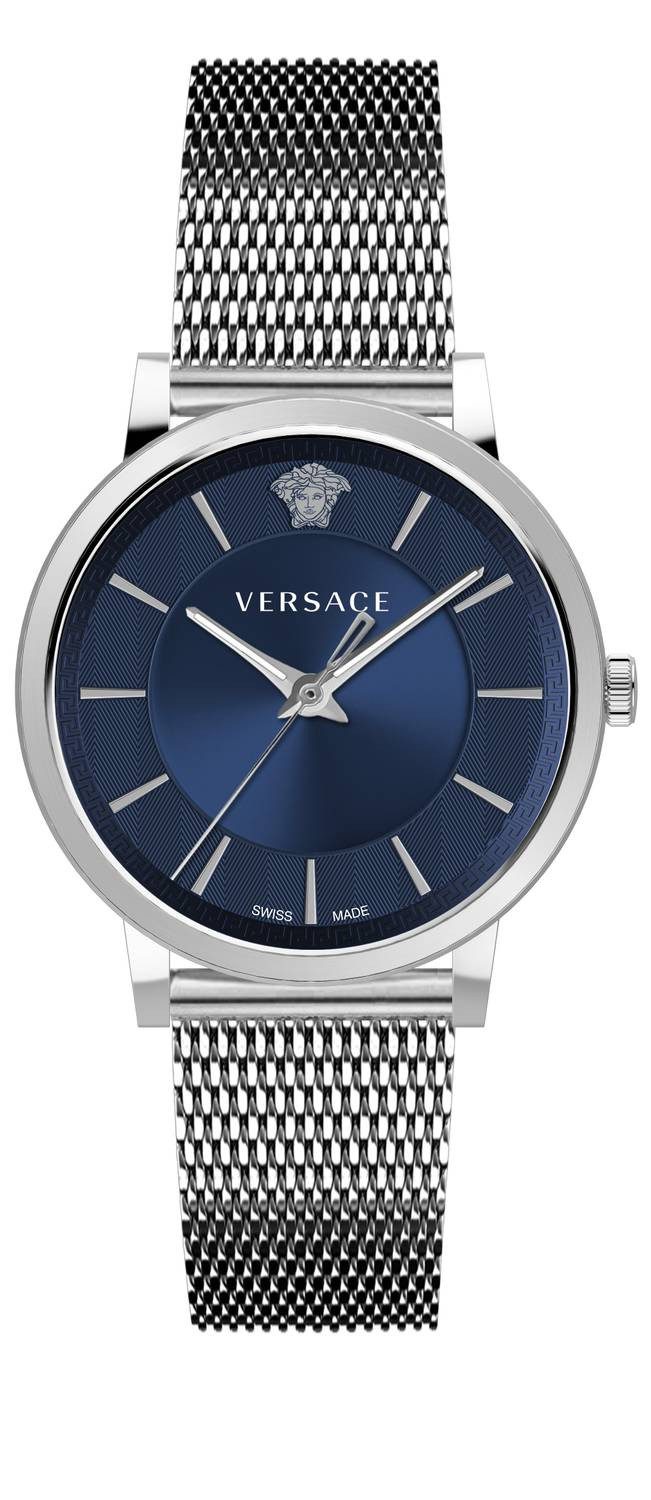 Das Zifferblatt enthält das Versace-Logo im 12-Uhr-Bereich und silbernen Indizes für die Stundenskala