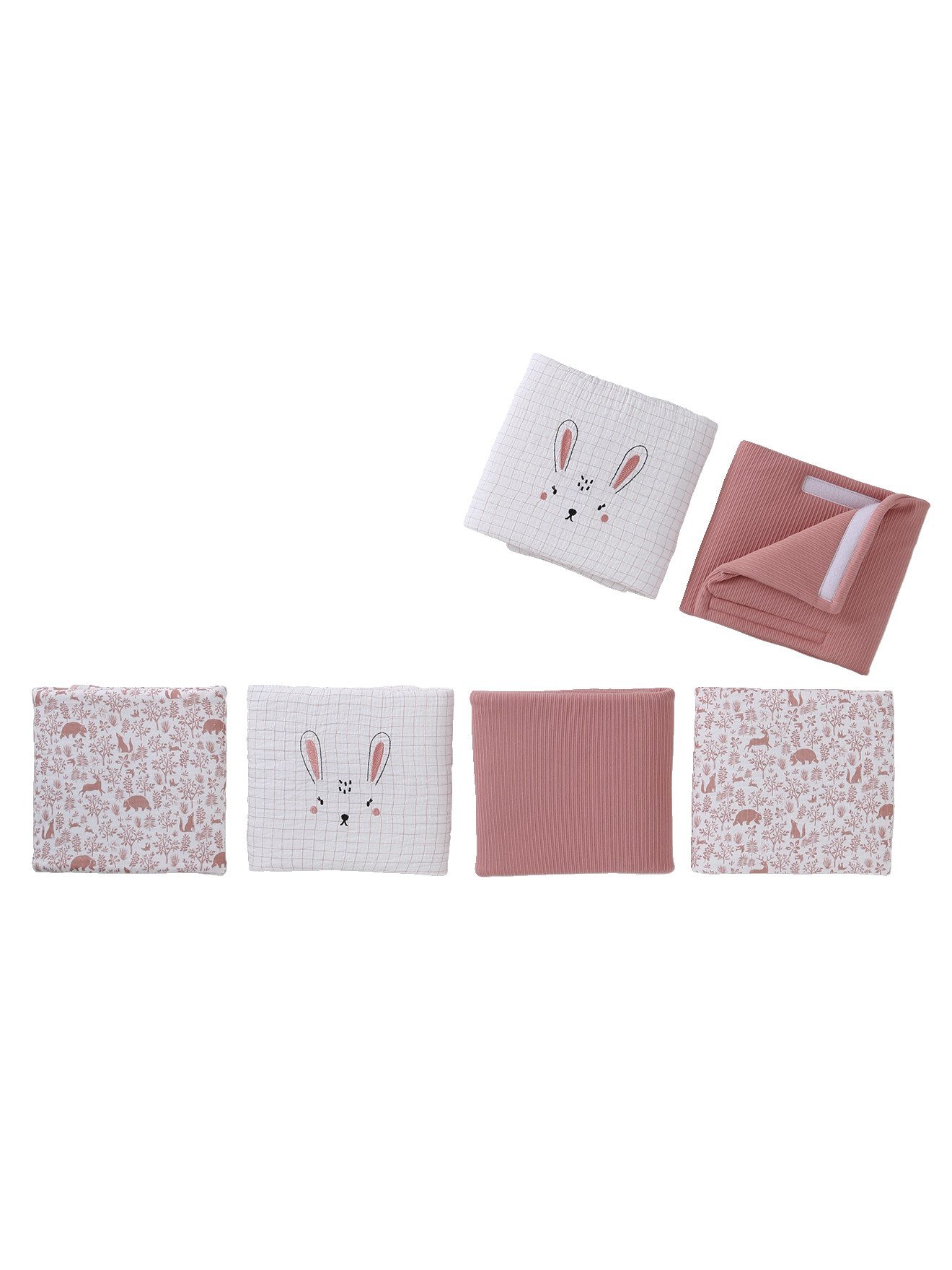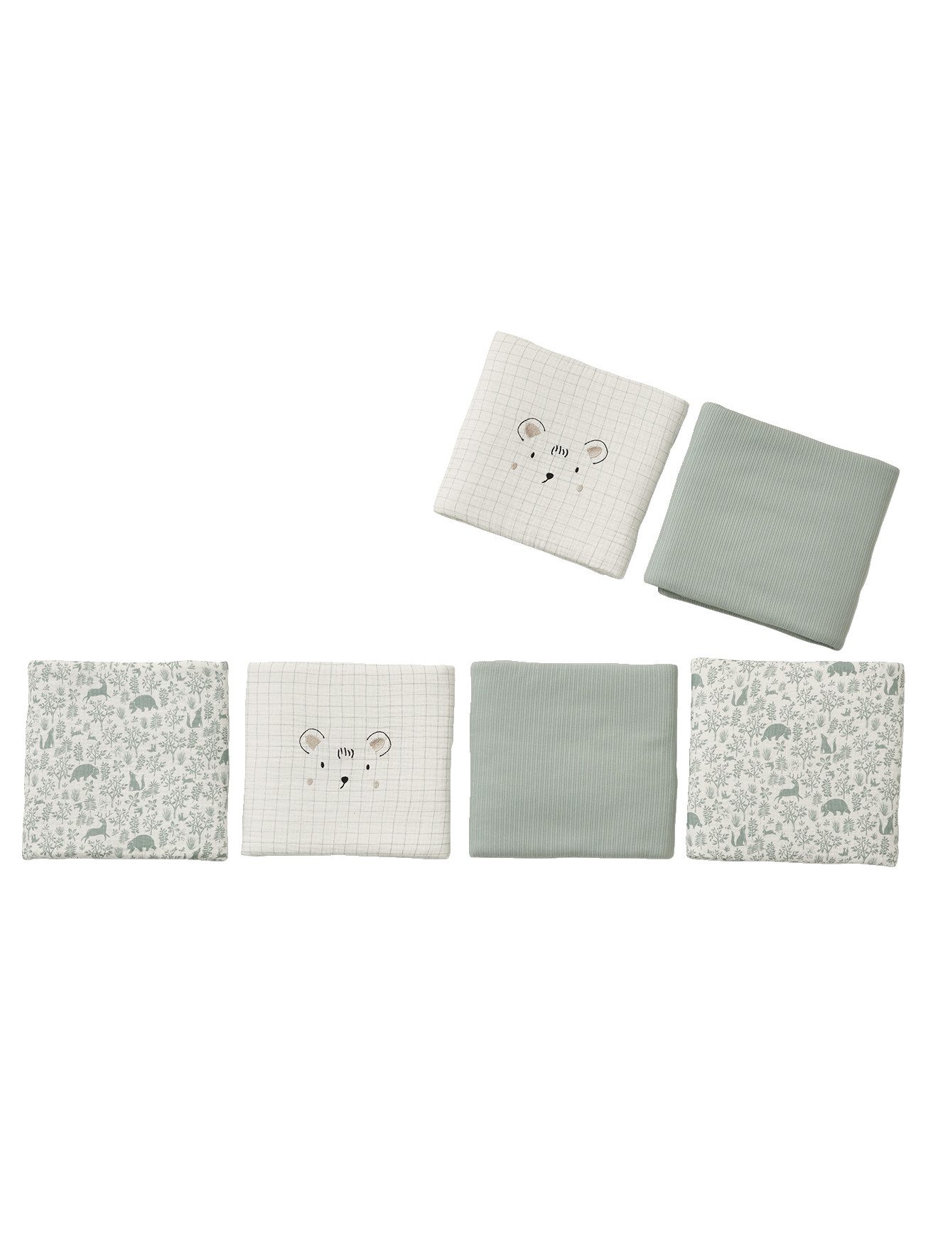 Details: Set aus 6 einzelnen Polstern Materialmix: Musselin und gerippter Jersey Druck- und Stickmotive Befestigung in variabler Reihenfolge mit Klett außen an den Gitterstäben Für handelsübliche Babybetten und Laufgitter geeignet