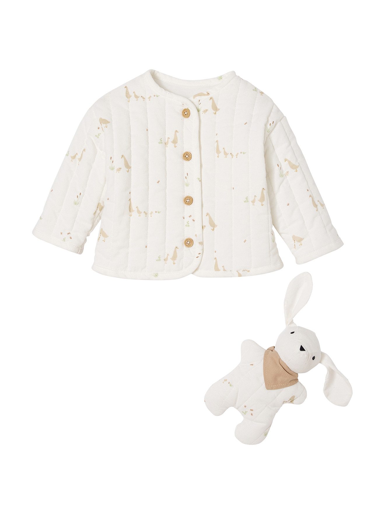Details: Cordjacke: Feincord mit Steppnähten. Wattiert. Knopfverschluss vorn. Allover bedruckt. Lange Ärmel. Durchgehend gefüttert. Schmusetuch: Hasendesign. Cordsamt, passend zur Jacke. Halstuch: Einfarbig. Lieferung in einem dekorativen Geschenkkarton