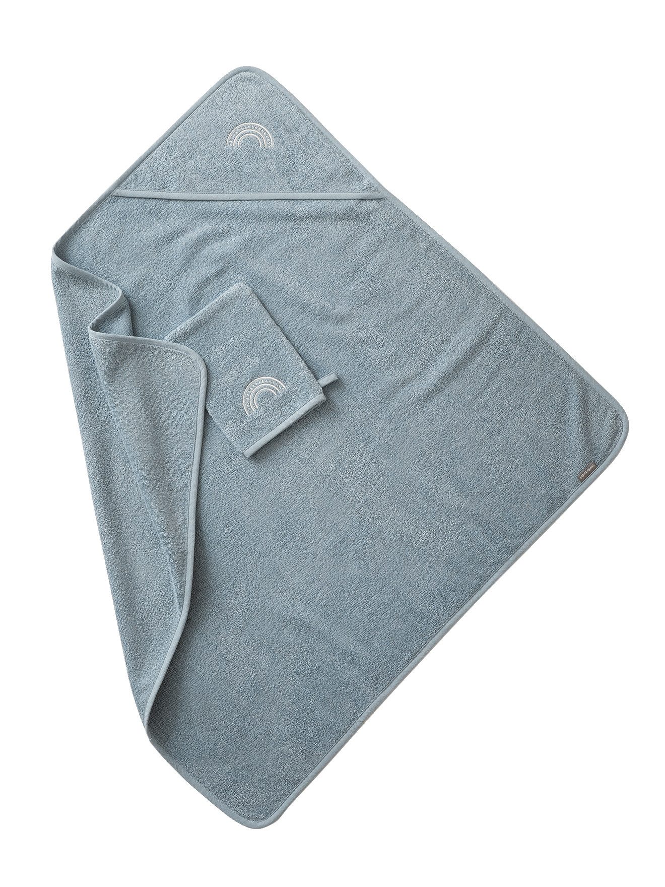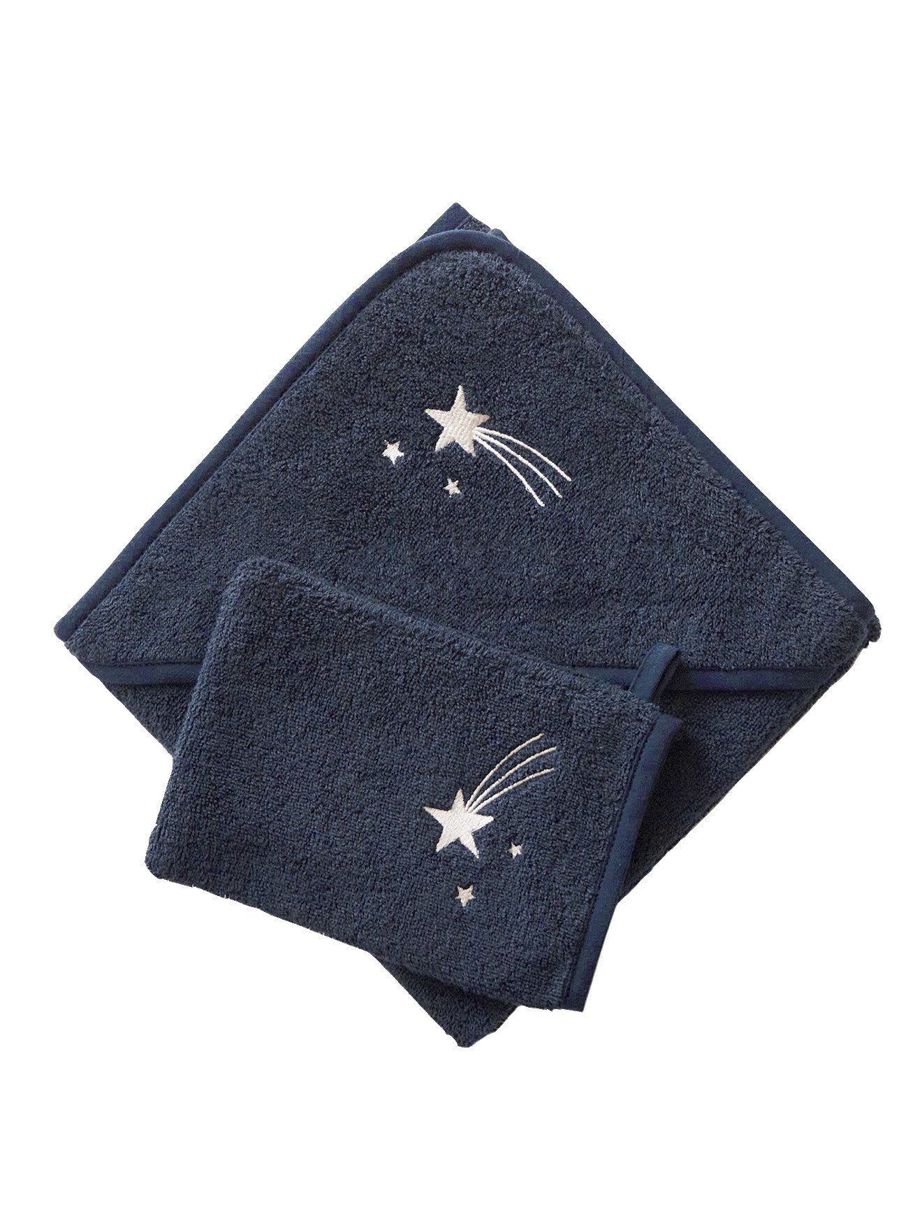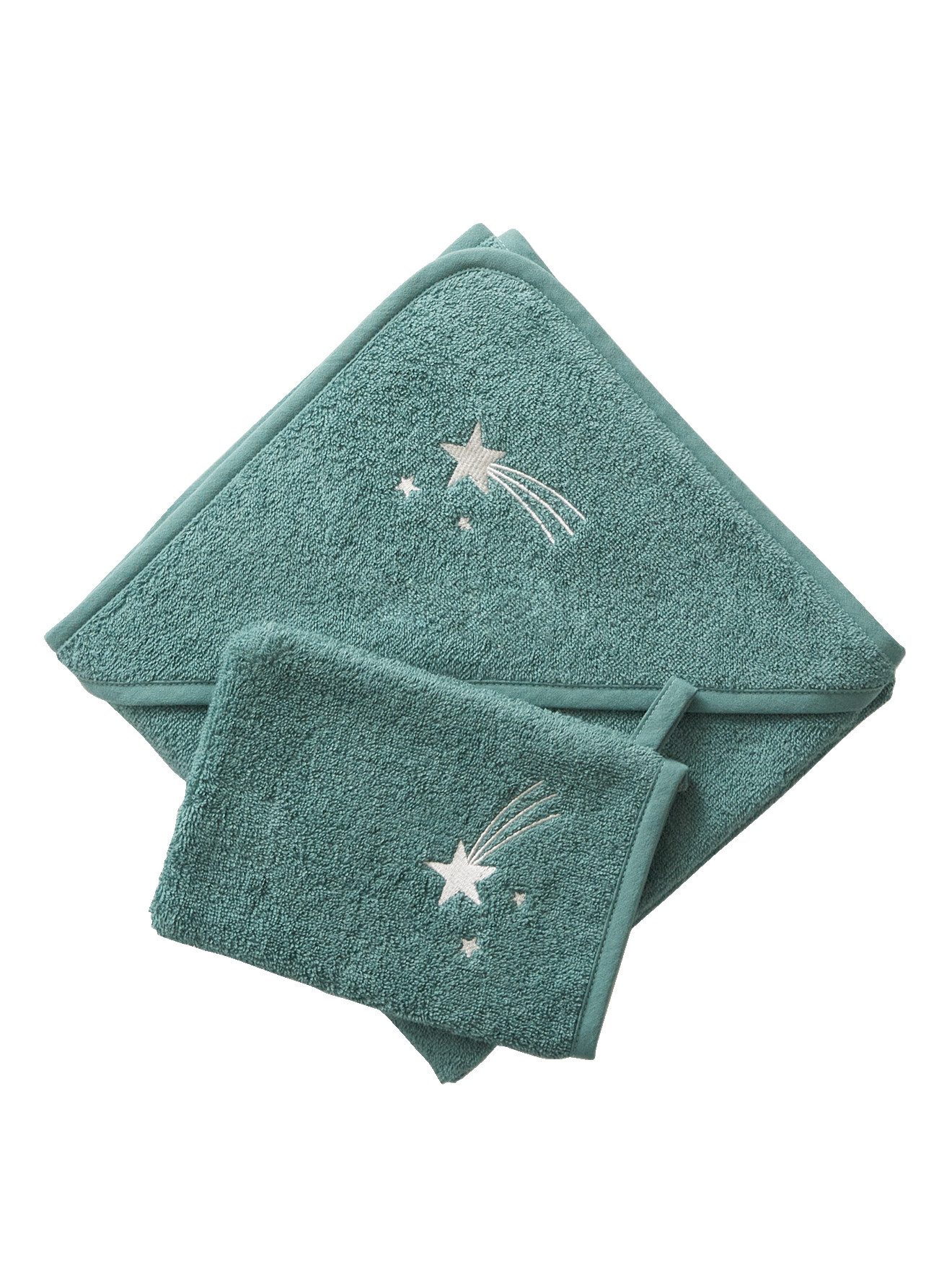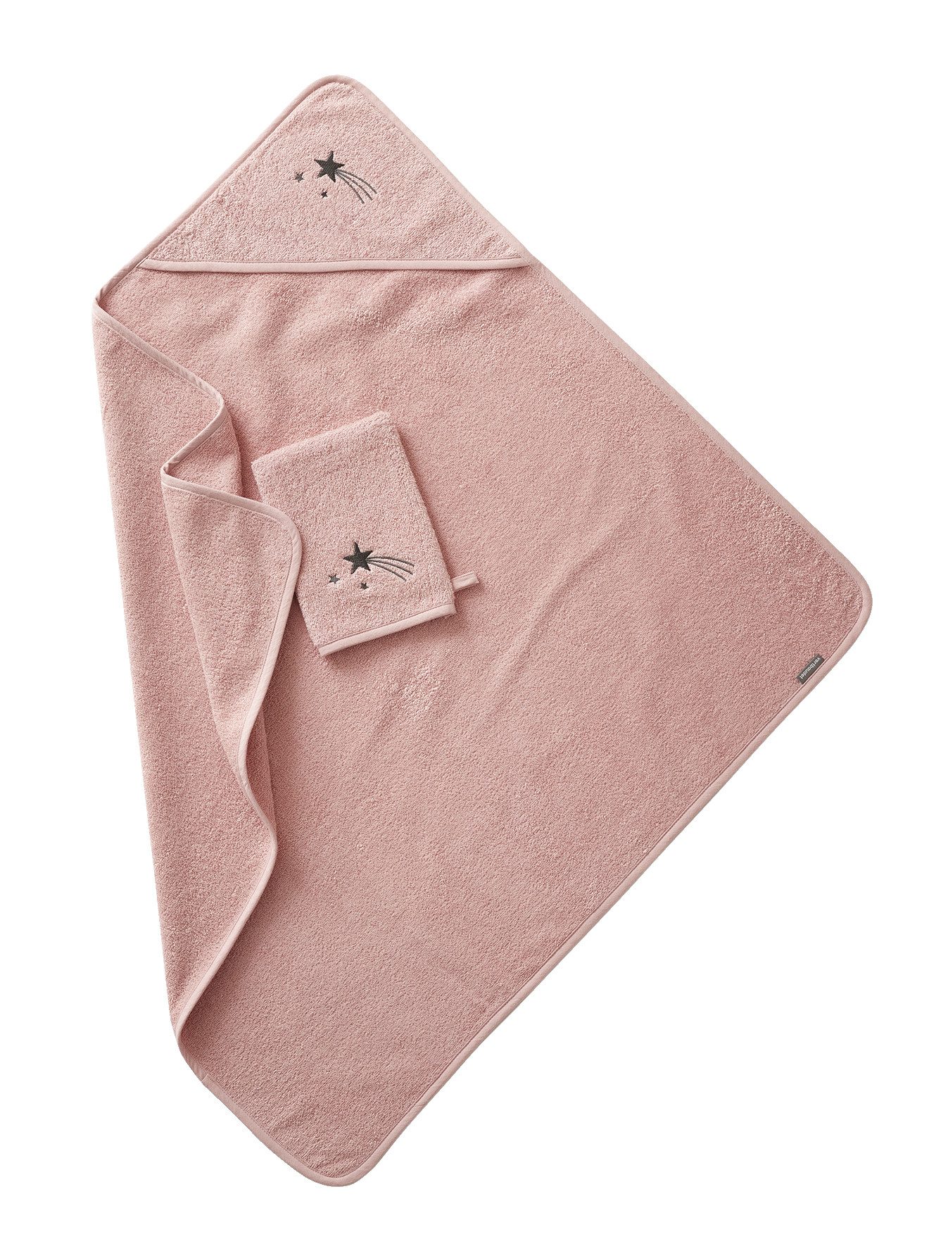 Stickerei auf der Kapuze und dem passenden Waschhandschuh, je nach Farbe Muschel, Sternschnuppe, Regenbogen