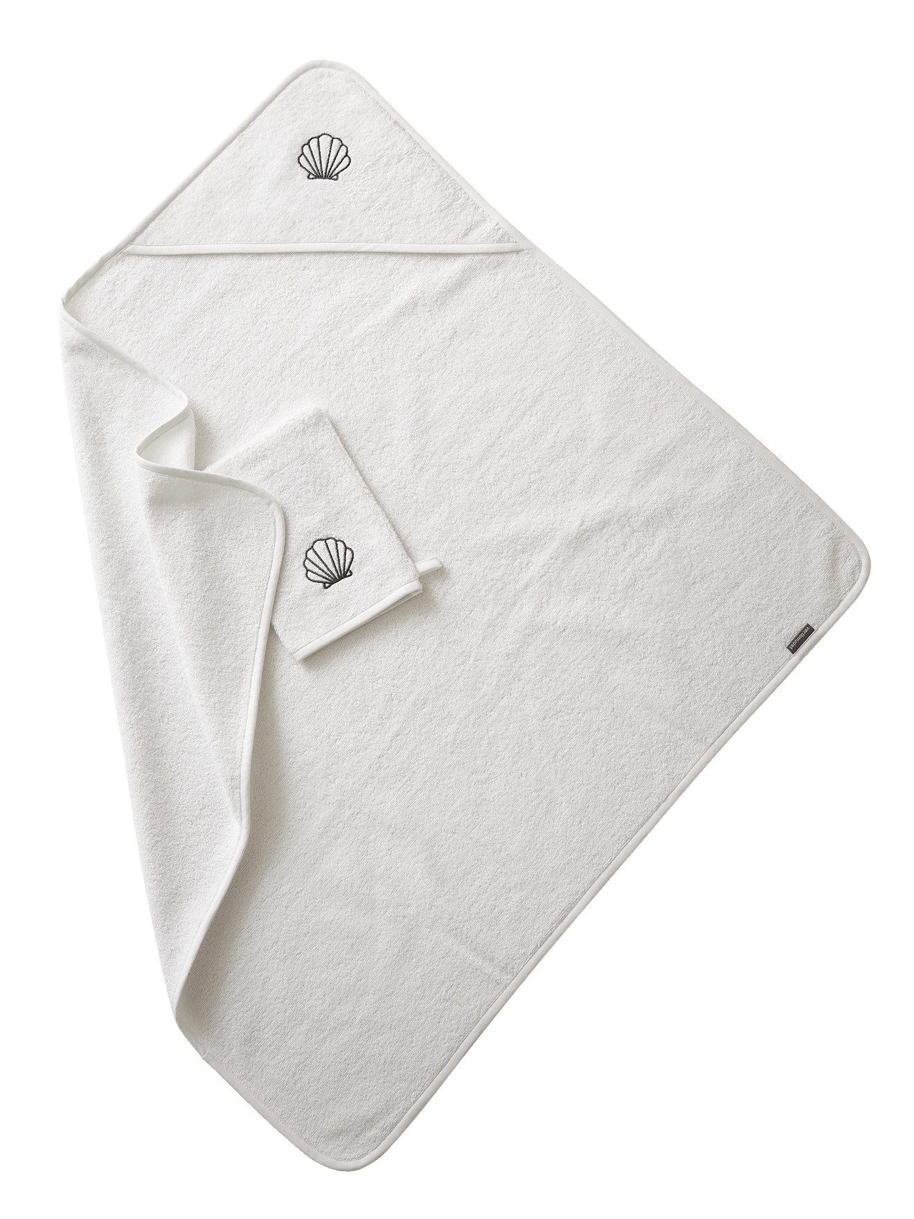 Stickerei auf der Kapuze und dem passenden Waschhandschuh, je nach Farbe Muschel, Sternschnuppe, Regenbogen Paspeliert