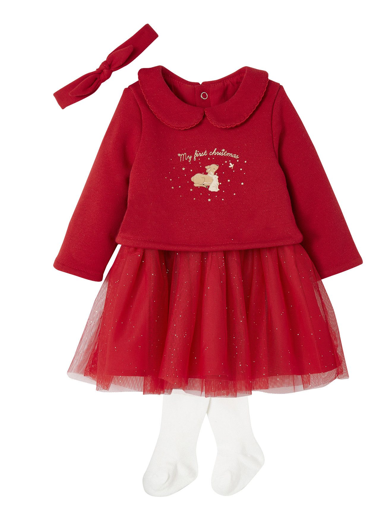 Details: Kleid: Materialmix mit Sweat-Oberteil und glitzerndem Tüllrock. Bubikragen. Motiv vorn. Druckknopfverschluss hinten. Haarband: Knotendetail oben. Gummizug im Nacken. Strumpfhose