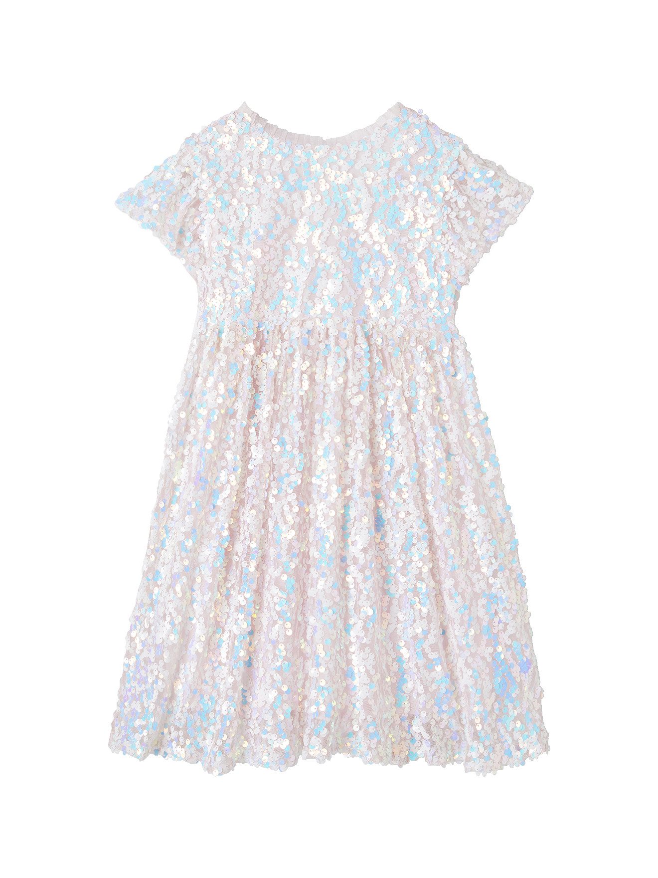 Details: Tüll, mit Pailletten bestickt und gefüttert Runder Ausschnitt mit schmalem Tüllvolant Kurze Schmetterlingsärmel Knopfverschluss hinten mit Glitzerknöpfen Вперед Rock mit Kräuselfalten in der Taille
