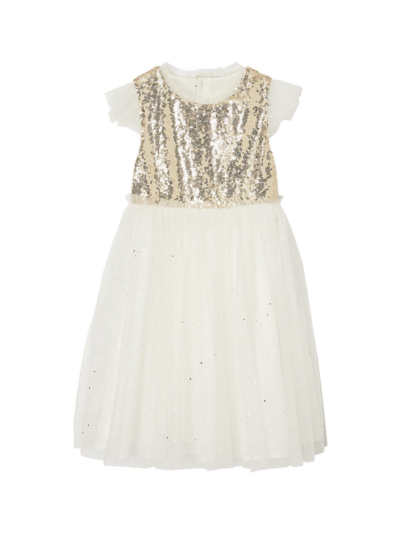Details: Oberteil mit aufgestickten Pailletten und schmalen Tüllvolants Runder Ausschnitt Kurze Ärmel aus Tüll Dekorativer Rückenausschnitt, Knopfverschluss Zweilagiger Tüllrock, obere Lage mit Glitzereffekt