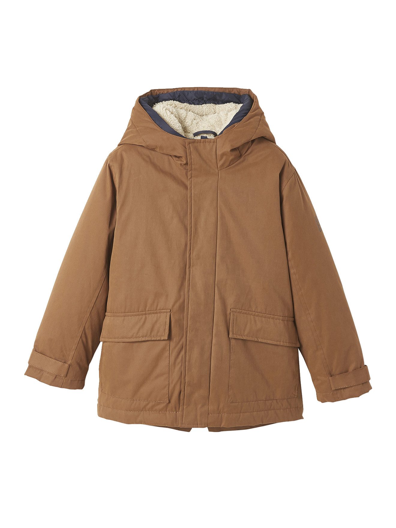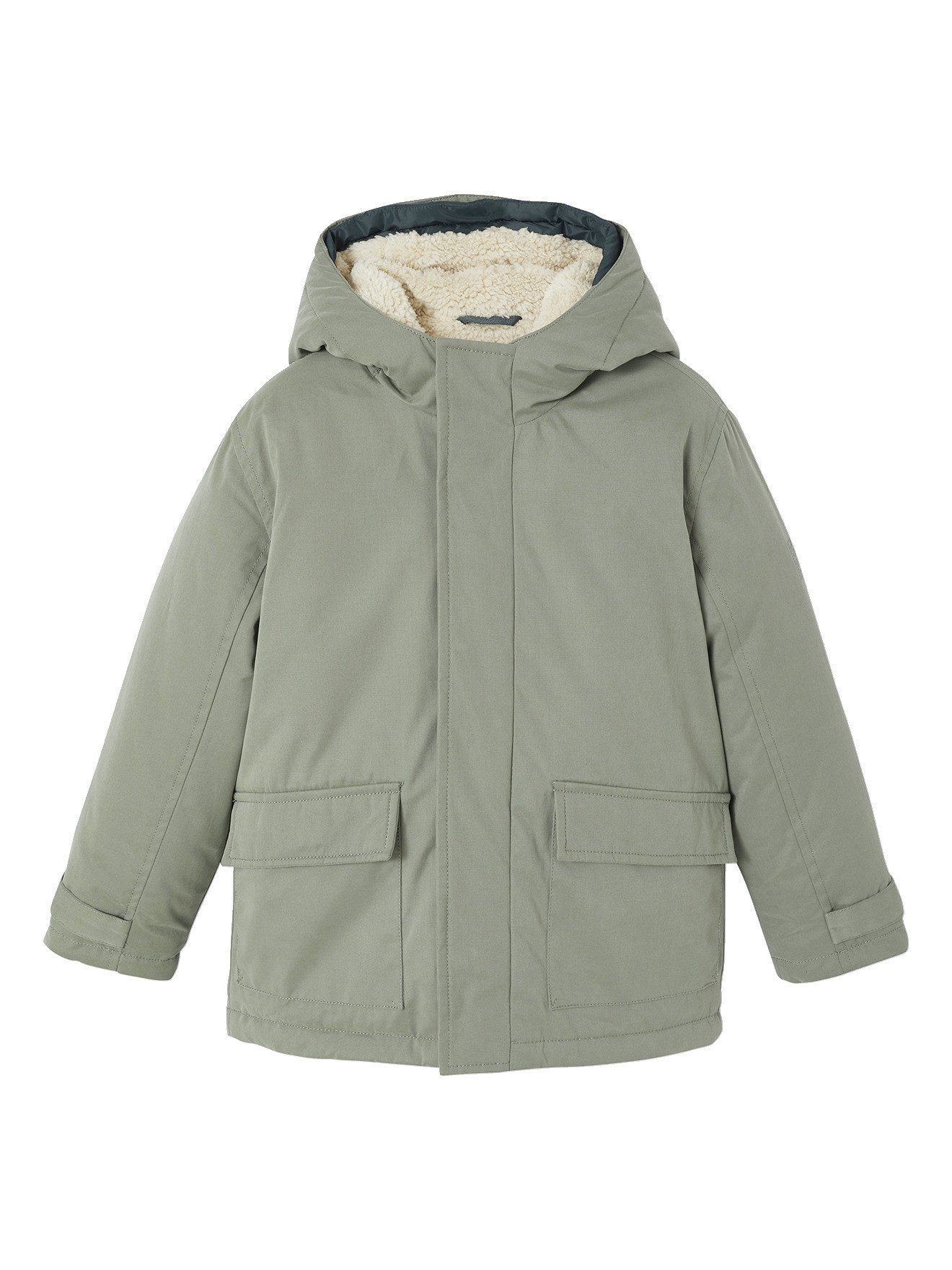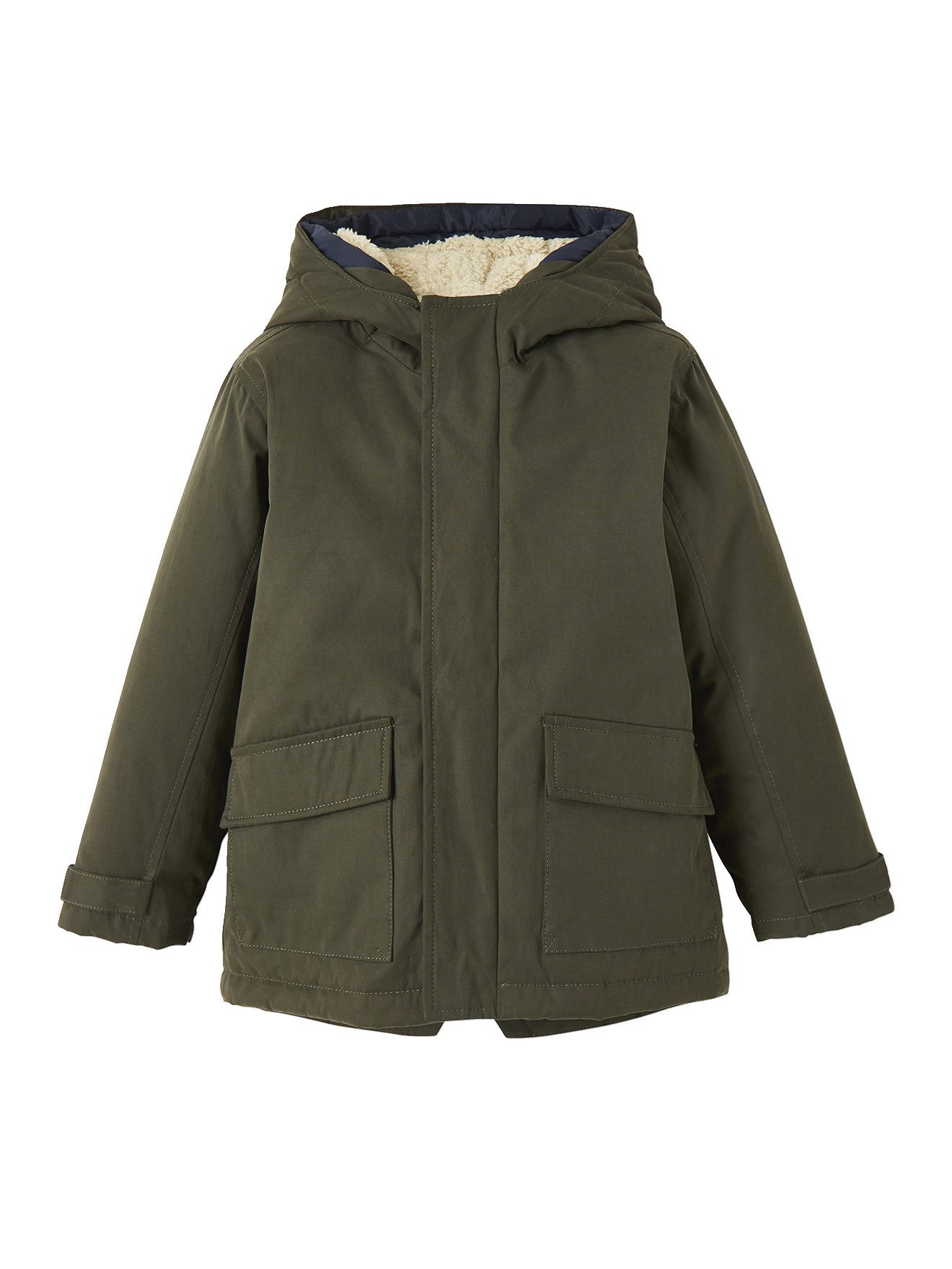 Details: Parka: Wasserabweisendes Material mit Soft-Touch. Kapuze mit Teddyfleece-Futter. Verdeckter Reißverschluss mit Druckknopfpatte und Kinnschutz. 2 Vordertaschen mit Patte. Klettriegel am Ärmelbündchen. Schriftzug an einem Ärmel. Beschreibbares Namensschild innen. Hinten längerer Saum. Kapuzenjacke: Reißverschluss mit Kinnschutz. Teddyfleece-Futter. Beschreibbares Namensetikett innen. Befestigung am Parka mit Reißverschluss.