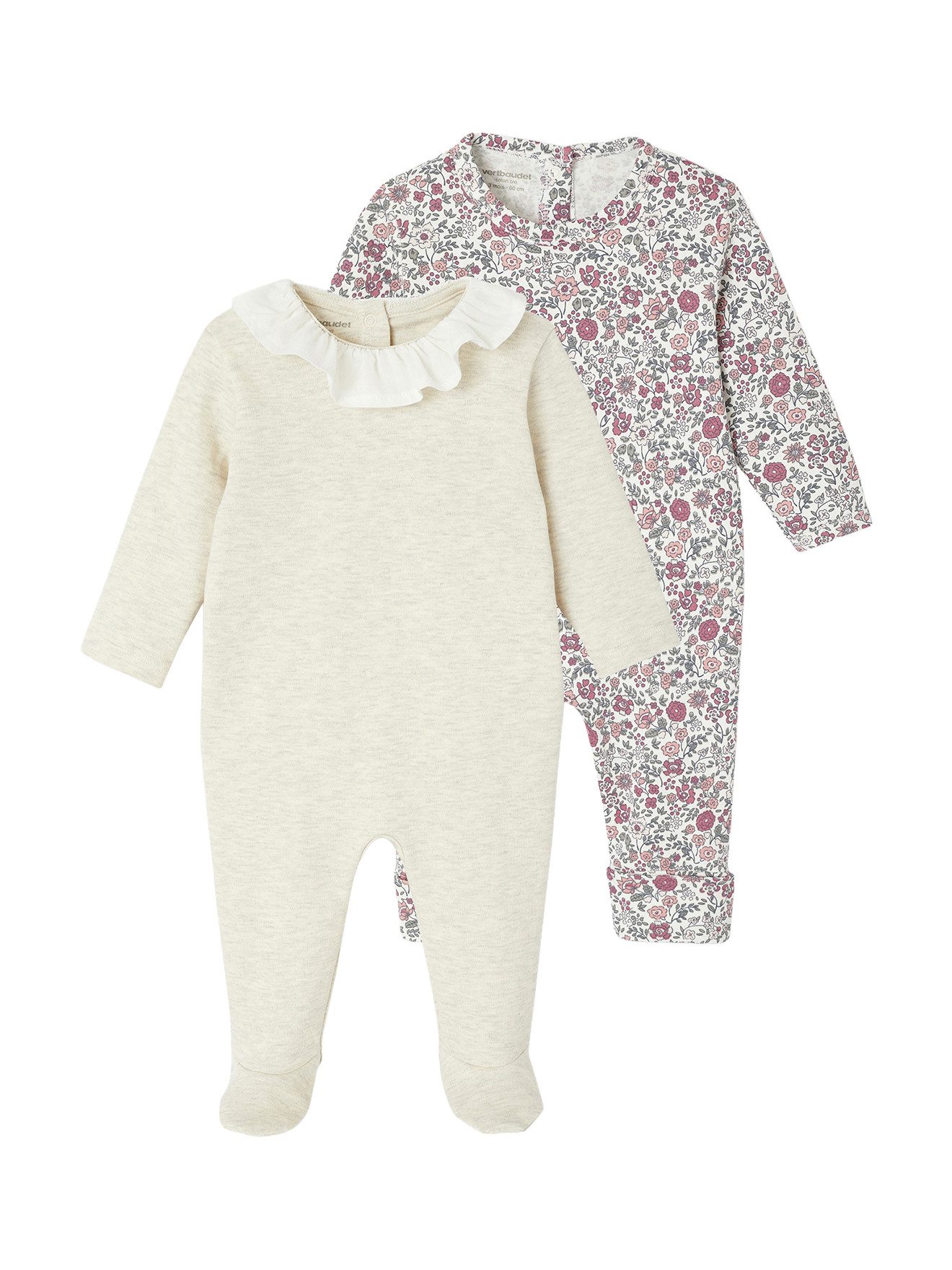 Details: 2er-Pack, sortiert: 1x uni: Volantkragen aus Voile. Öffnung am Rücken. Lange Ärmel. 1x allover bedruckt: Öffnung vorn. Lange Ärmel. Füße zum Umschlagen. Weicher, wärmender Interlock