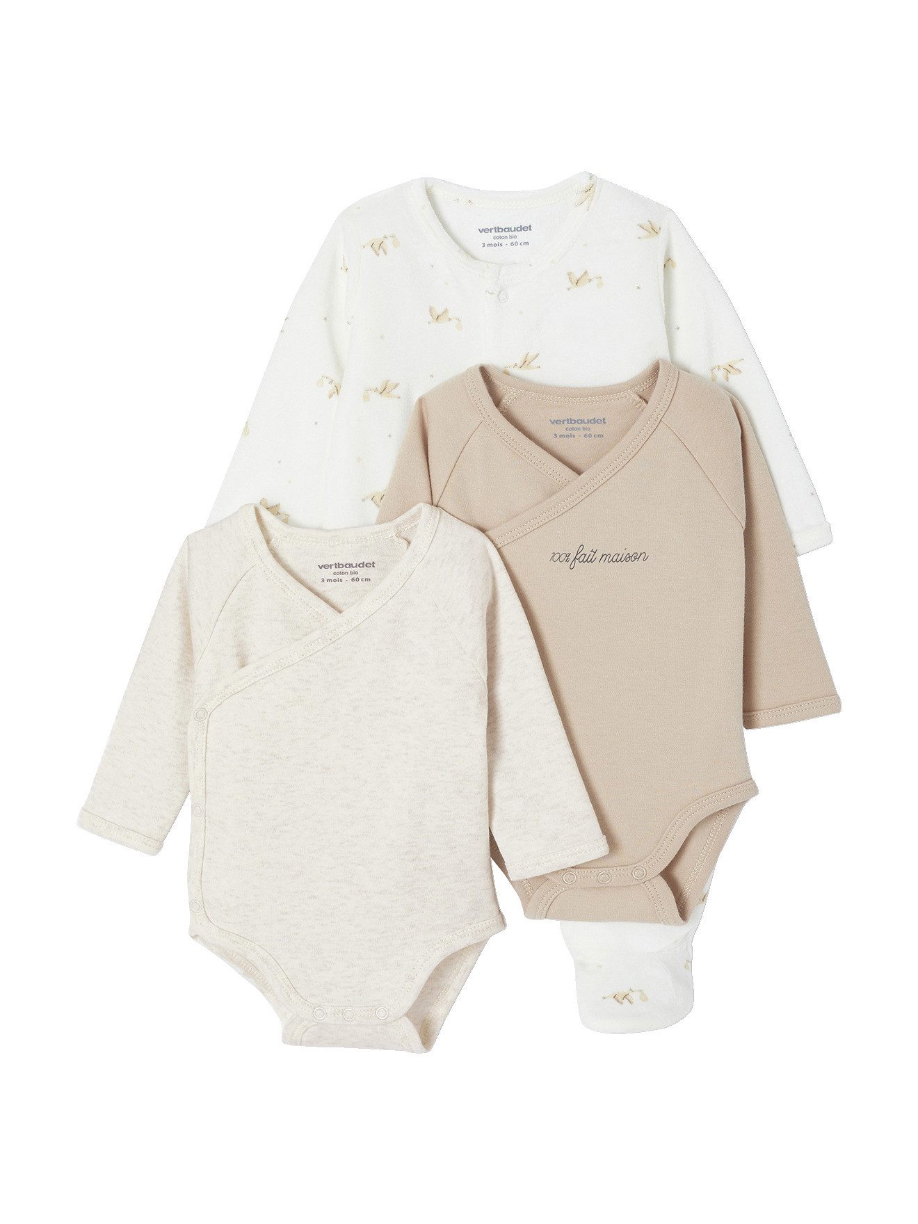Details: Strampler: Samt. Allover bedruckt mit Störchen. Druckknopfverschluss vorn. 2 Bodys: 1x uni + 1x mit Printmotiv vorn. Wickelform mit Druckknopfverschluss vorn.
