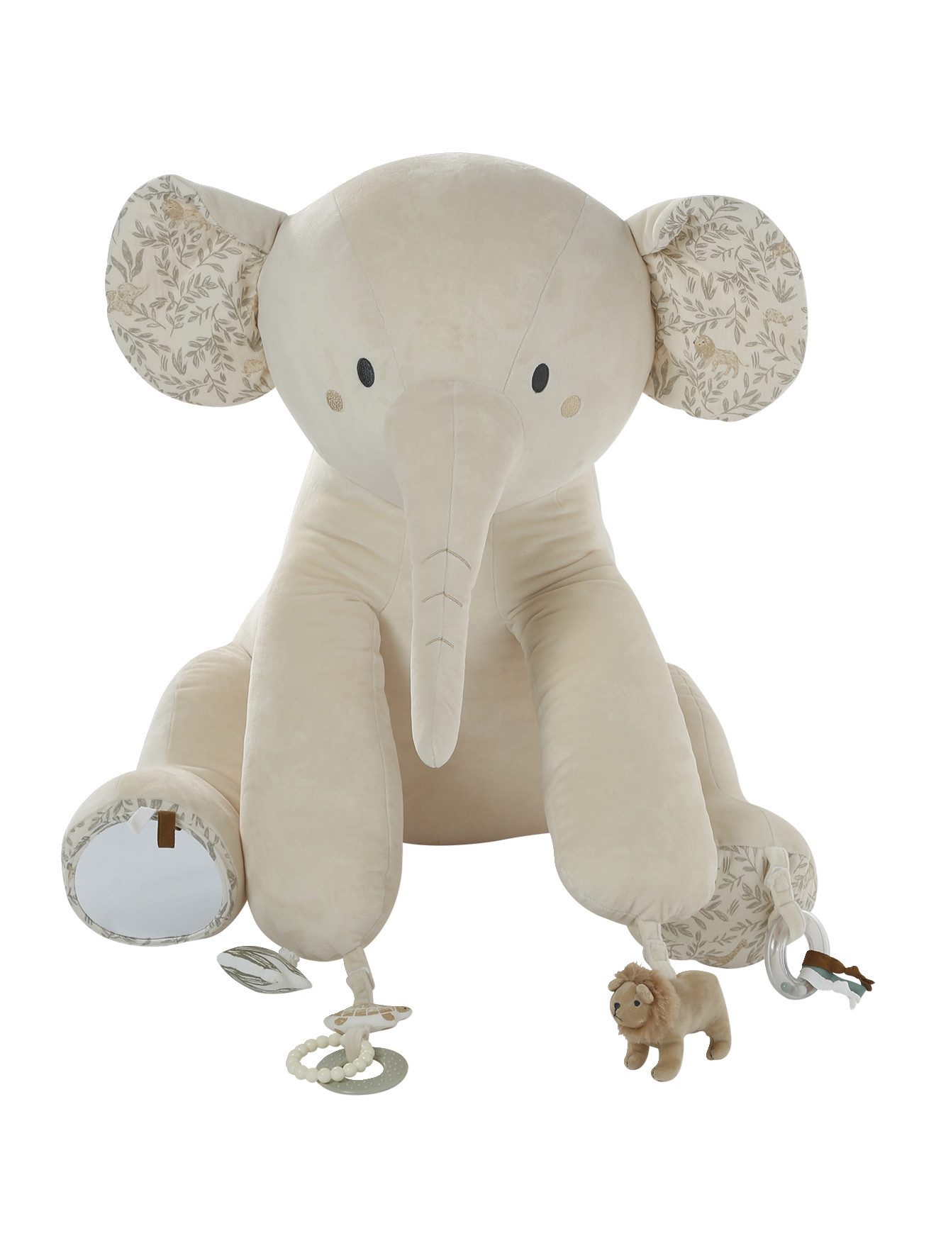 Details: Elefant mit Körper aus Samt, Ohren und Hinterfüße aus Baumwollmusselin Aufgesticktes Gesicht Vorderfuß rechts: Klettband mit Baumwoll-Schildkröte und Beißringen aus Silikon und Kunststoff; Band an der Seite mit Brumm-Blatt zum Aufziehen aus wattiertem Baumwollstoff Vorderfuß links: Abnehmbarer Quietsche-Löwe aus Plüsch an einem Band Hinterfuß rechts: Spiegel + 2 bunte Baumwollbändchen Hinterfuß links: Transparenter Ring mit bunten Kugeln darin, bunte Baumwollbändchen darüber Hinten: Tasche mit Plüschlöwe aus Samt zum Hineinstecken Fördert die sensorische Entwicklung und die Feinmotorik Stärkt die emotionale Bindungsfähigkeit
