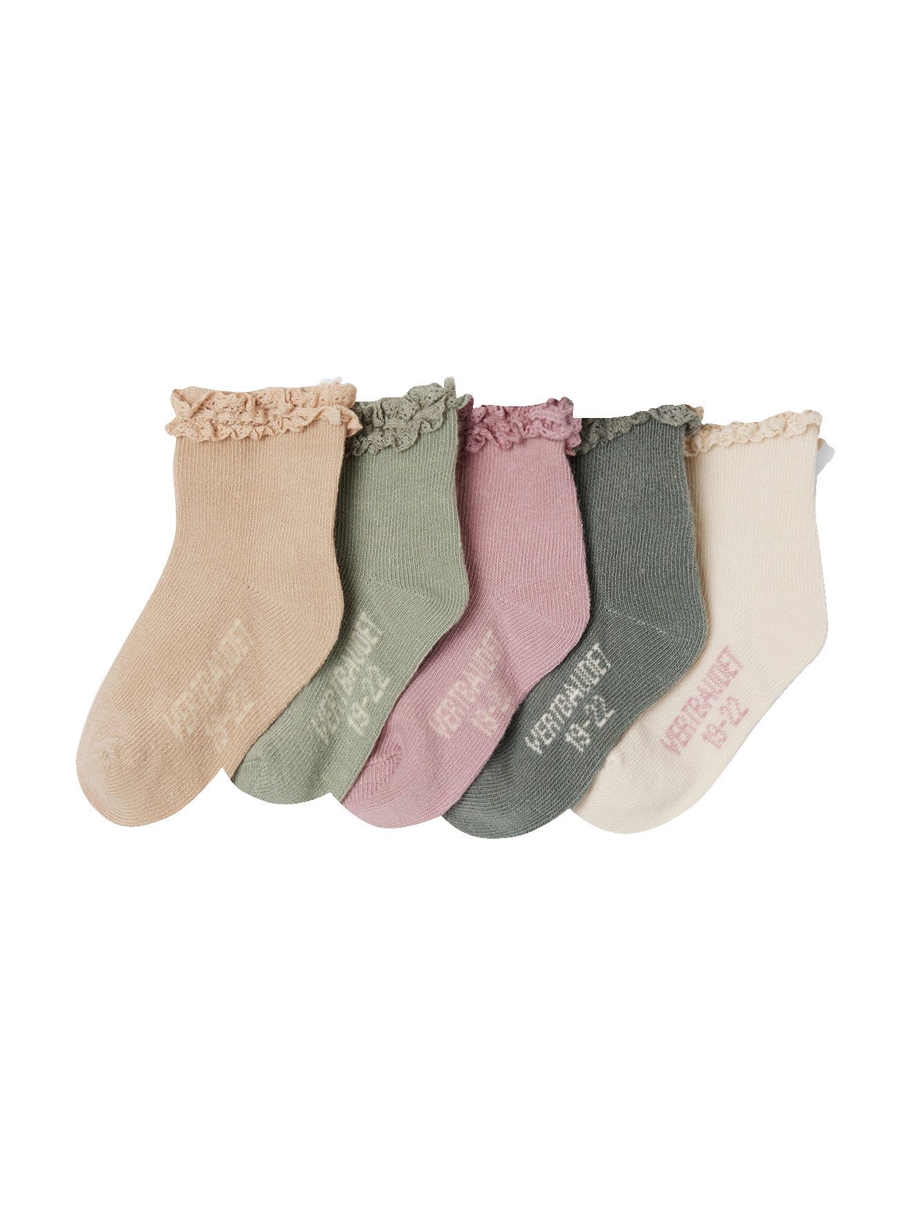 5 Paar, farblich sortiert: 2x zartrosa + 2x grau meliert + 1x weiß Ferse und Zehen verstärkt Umschlag mit Spitze