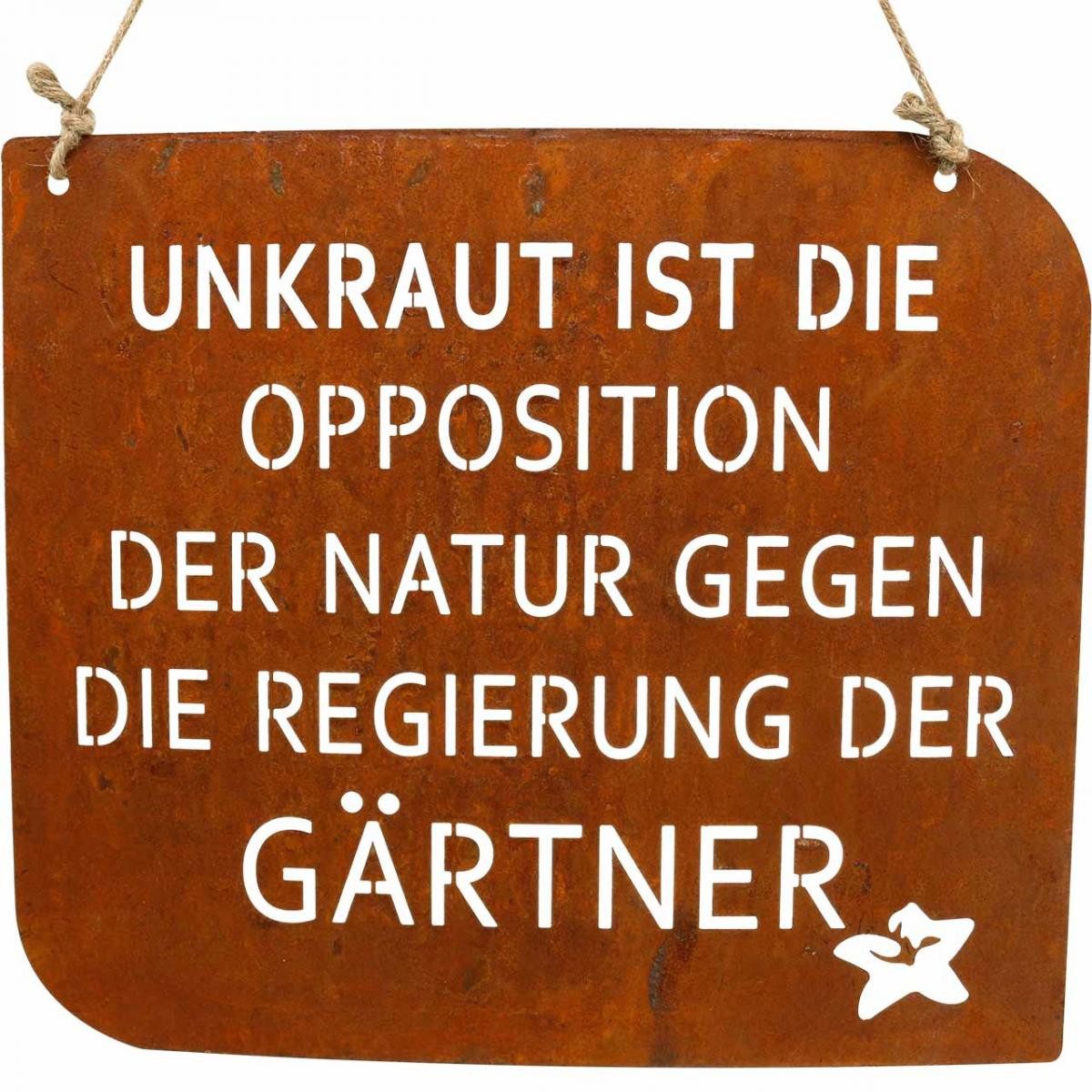 Das Gartenschild fügt sich harmonisch in jede Umgebung ein. Ob an einem Ast, einem Gartenzaun oder einem Balkongeländer aufgehängt – die praktische Jutekordel macht das Anbringen besonders leicht. Die Rostdekoration unterstreicht den Charakter von naturverbundenen Gärten und sorgt für ein einzigartiges Ambiente.