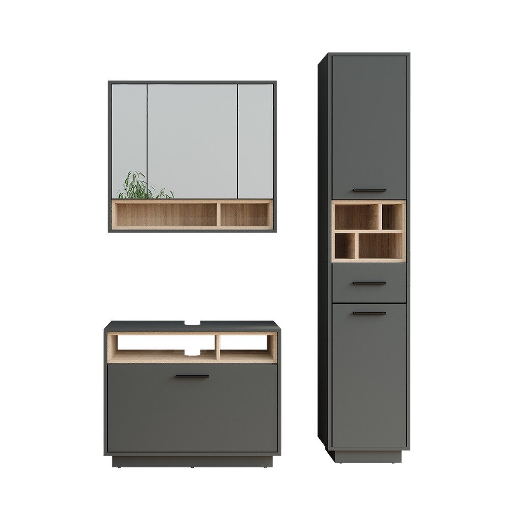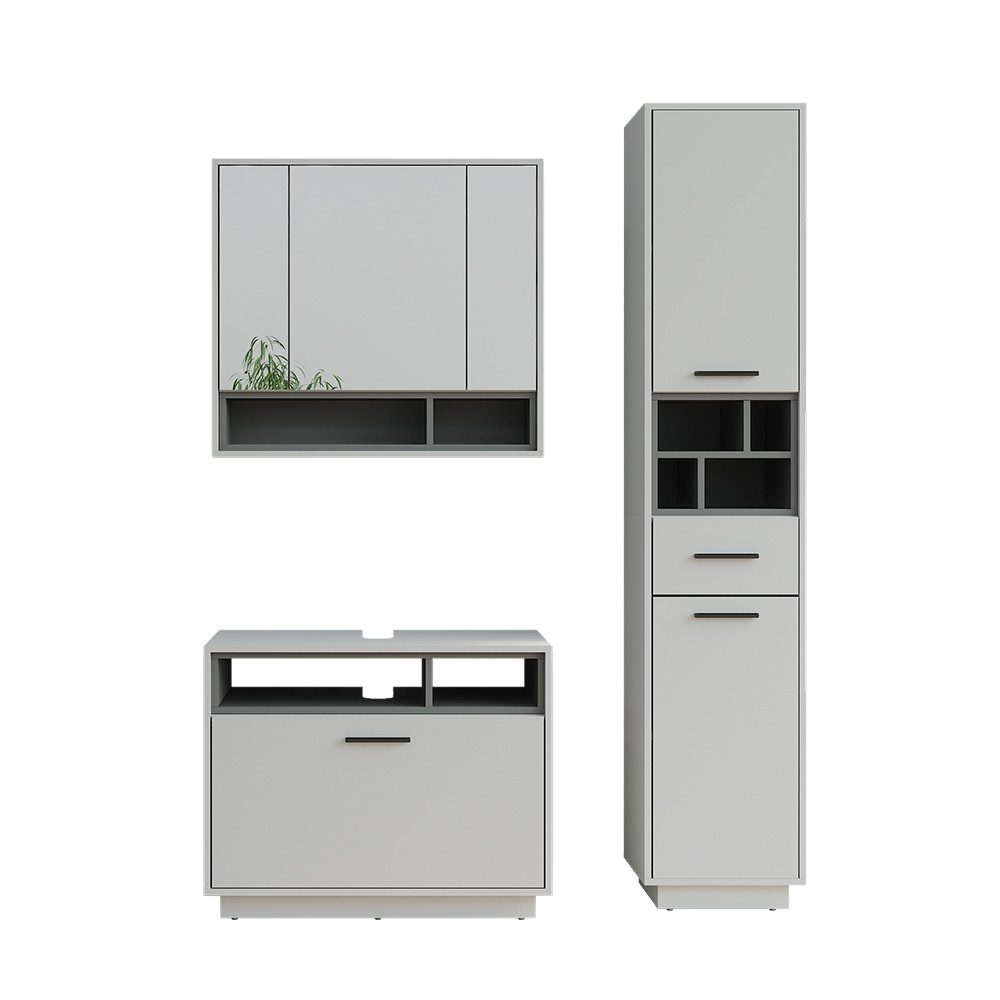 LIEFERUMFANG: Waschbeckenunterschrank, Spiegelschrank, Hochschrank, Montageanleitung, Montagematerial (Dekoration nicht enthalten).#27951